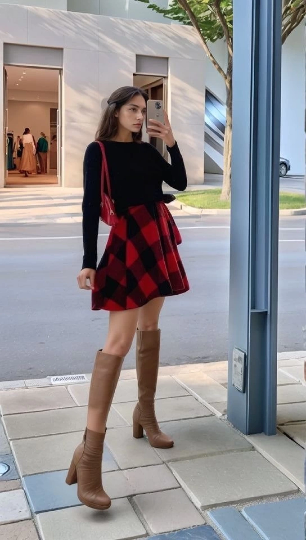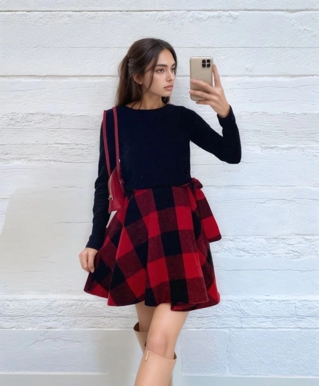 Kadın Uzun Kollu Bisiklet Yaka üst Viskon Alt Ekose Kısa Elbise