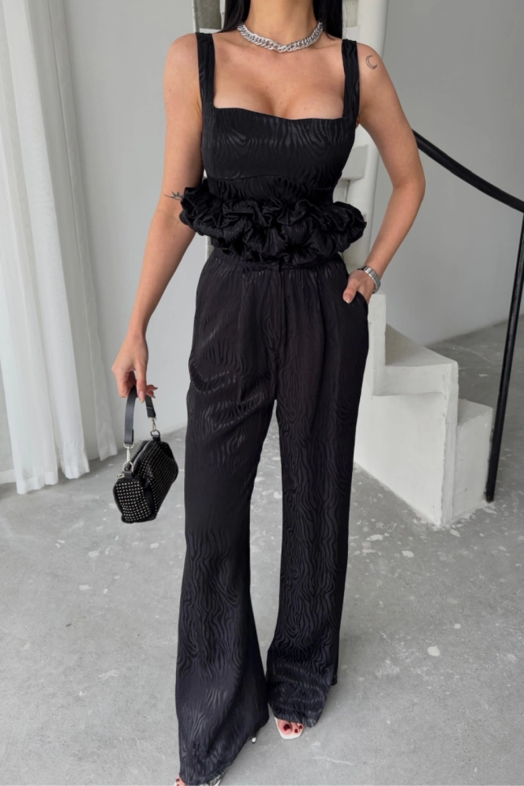 JAKARLI BLUZU TASARIM DETAYLI CEKET-PANTOLON-BLUZ 3 LÜ TAKIM - Siyah