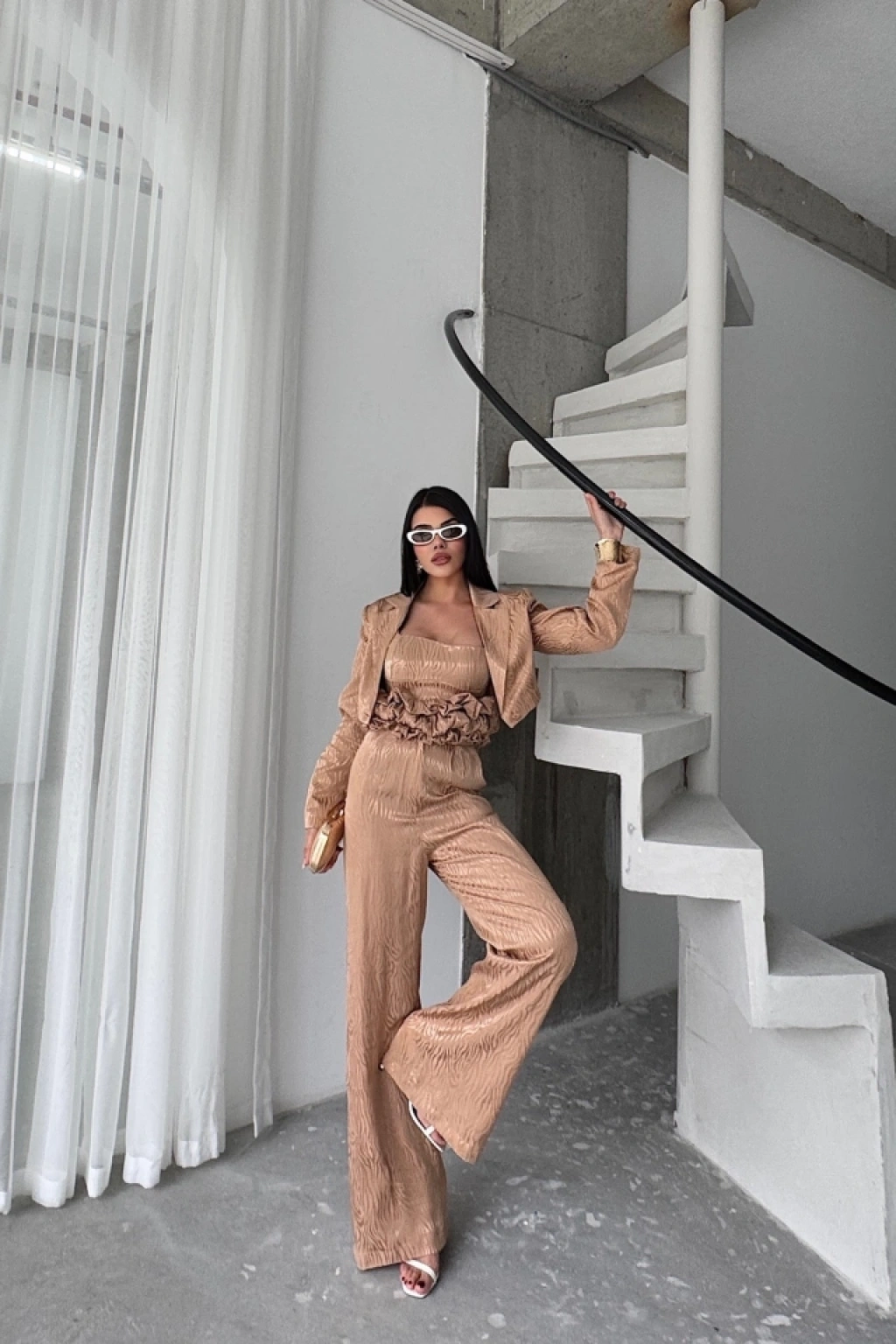 JAKARLI BLUZU TASARIM DETAYLI CEKET-PANTOLON-BLUZ 3 LÜ TAKIM - Bej