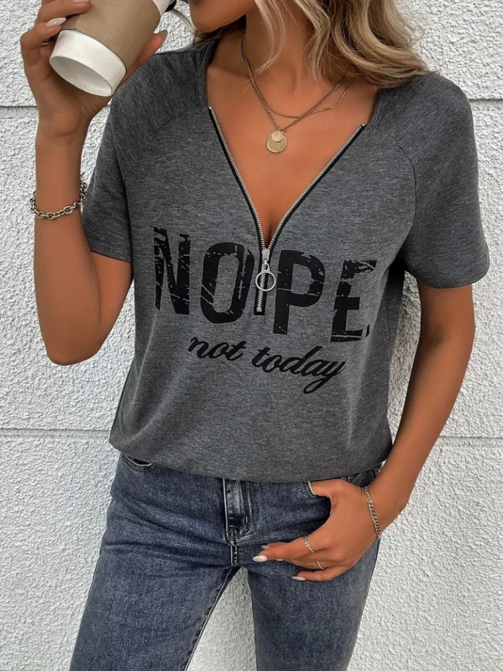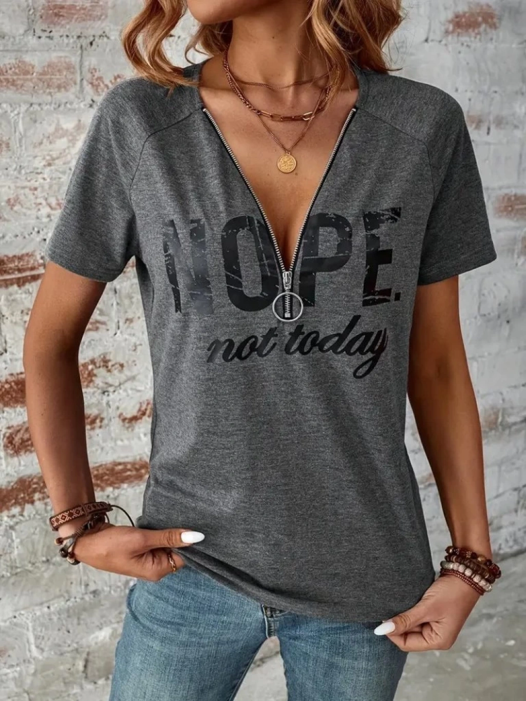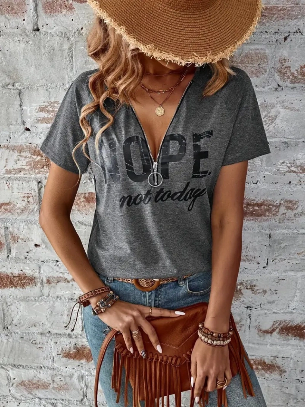 Kadın Kısa Kollu önden Fermuarlı Yazı Baskılı Viskon Bluz