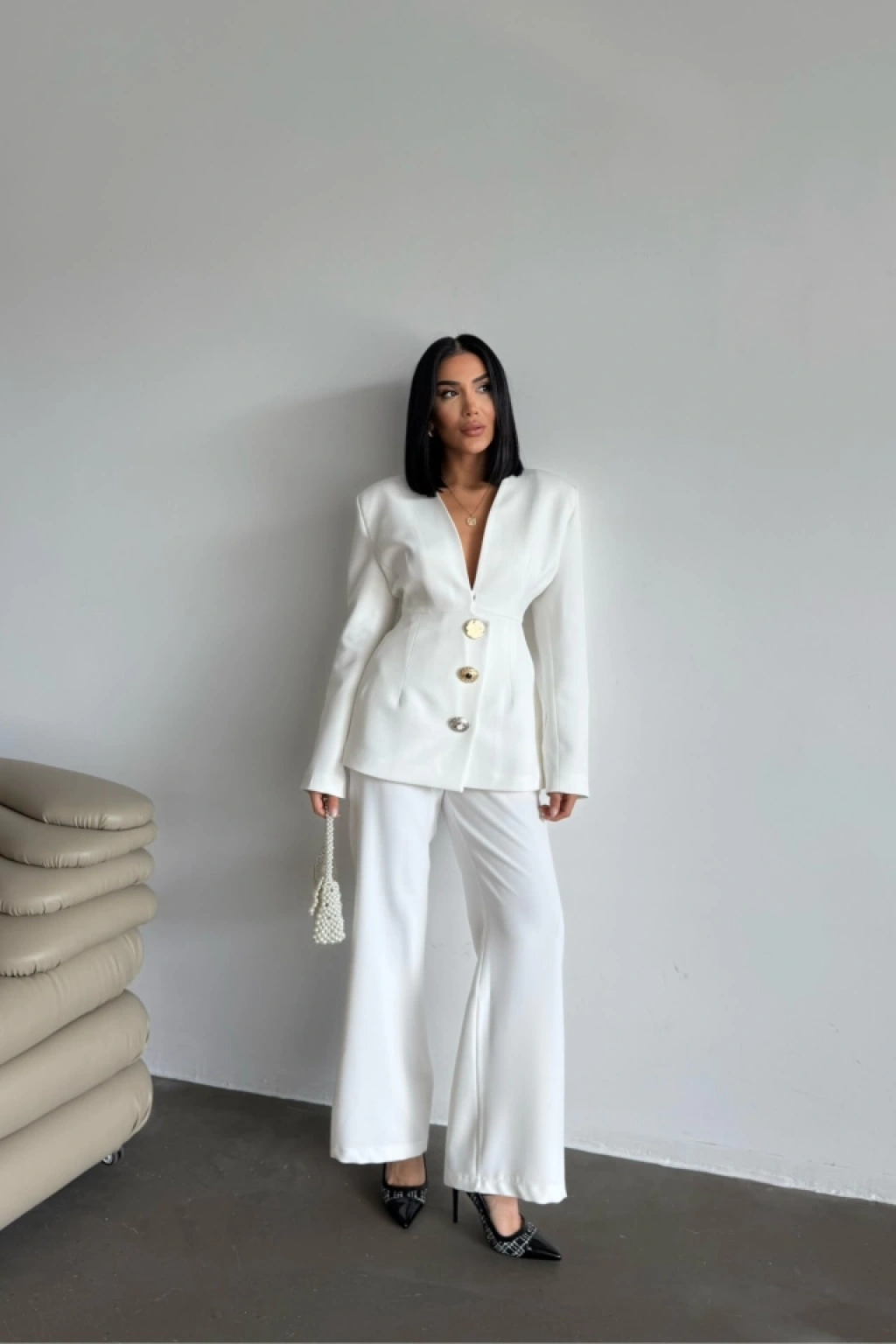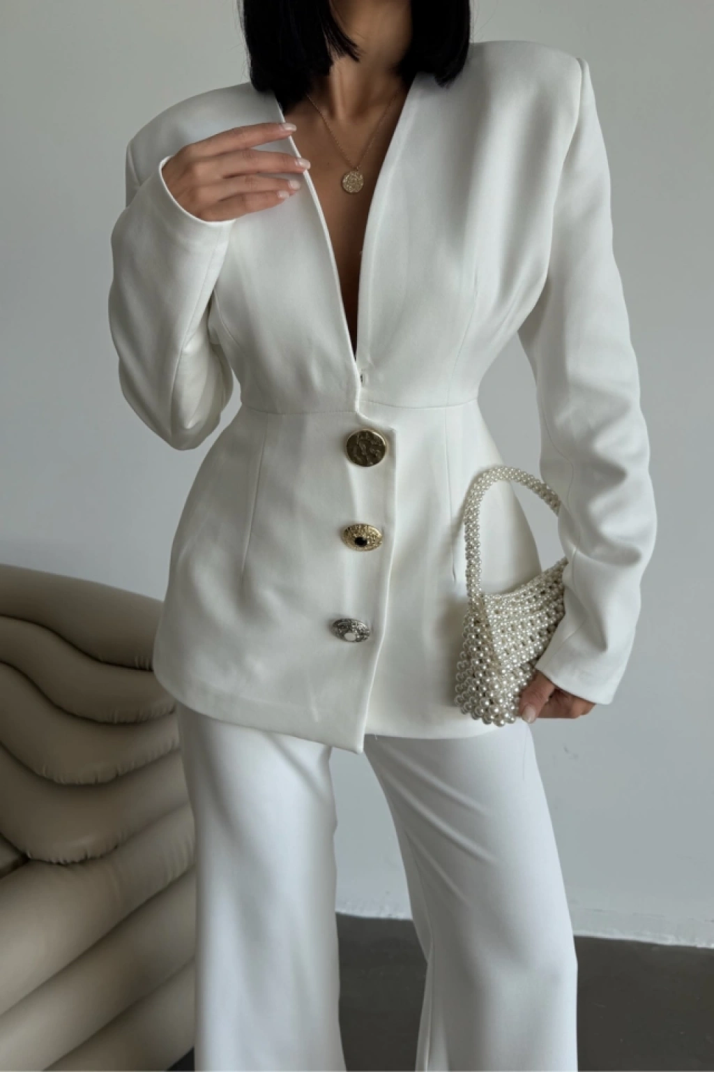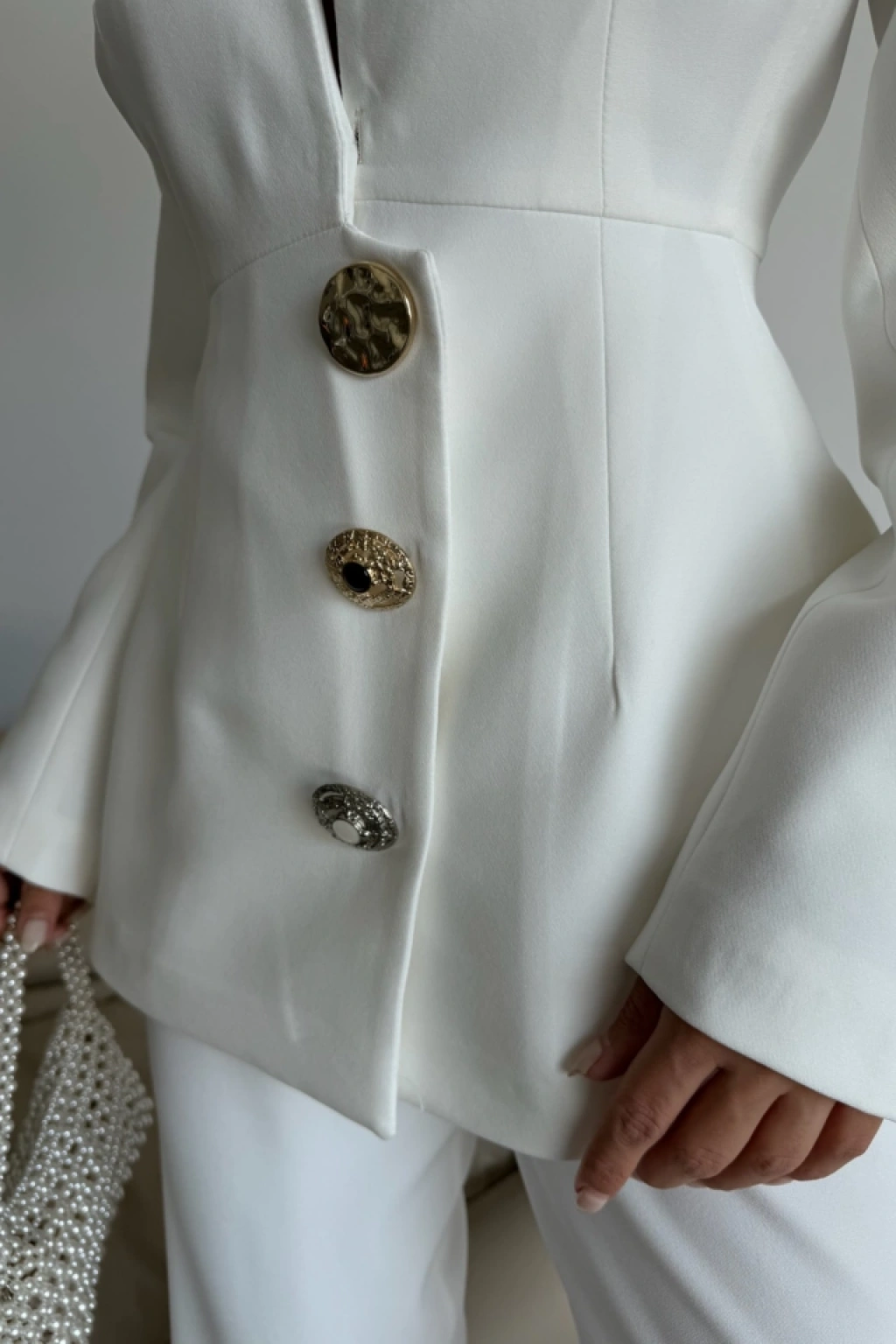 TASARIM CEKET-PANTOLON TAKIM METAL DÜĞME DETAYLI - Beyaz