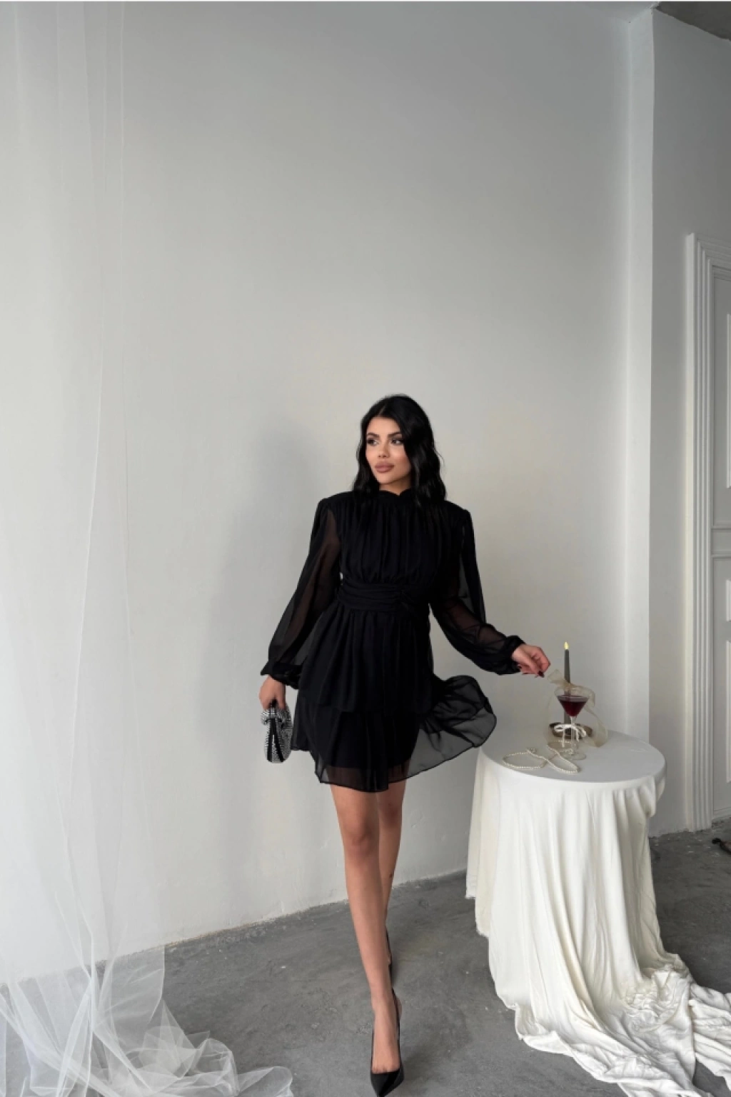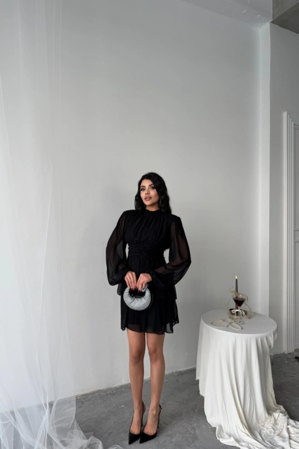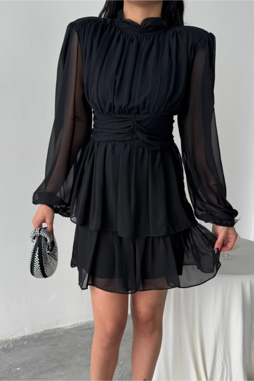 ŞİFON KATLI UZUN KOL ELBİSE - Siyah