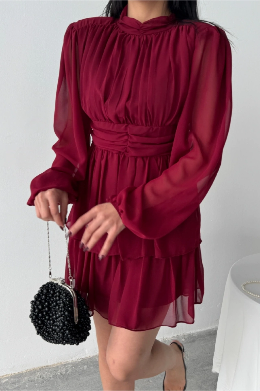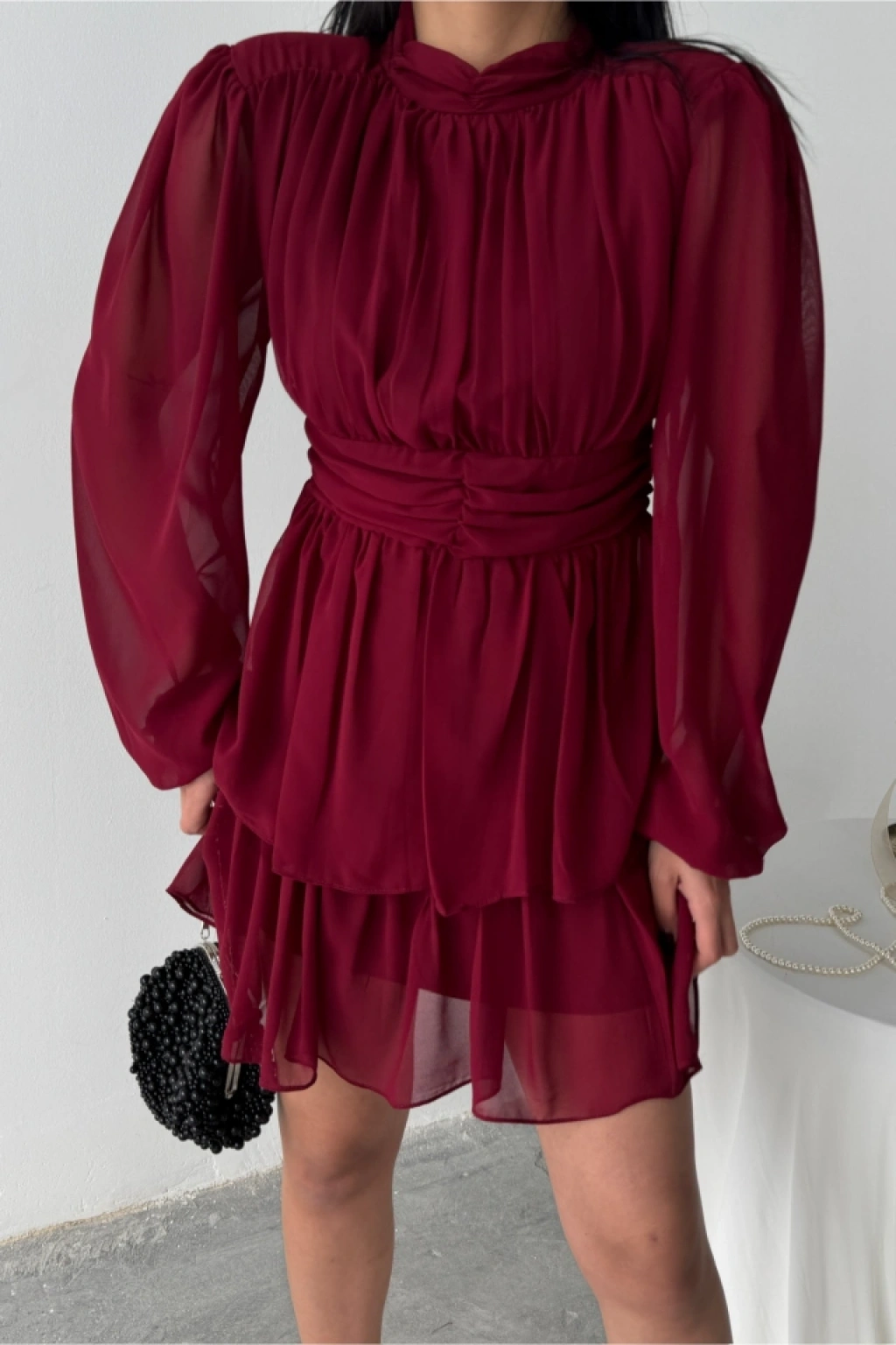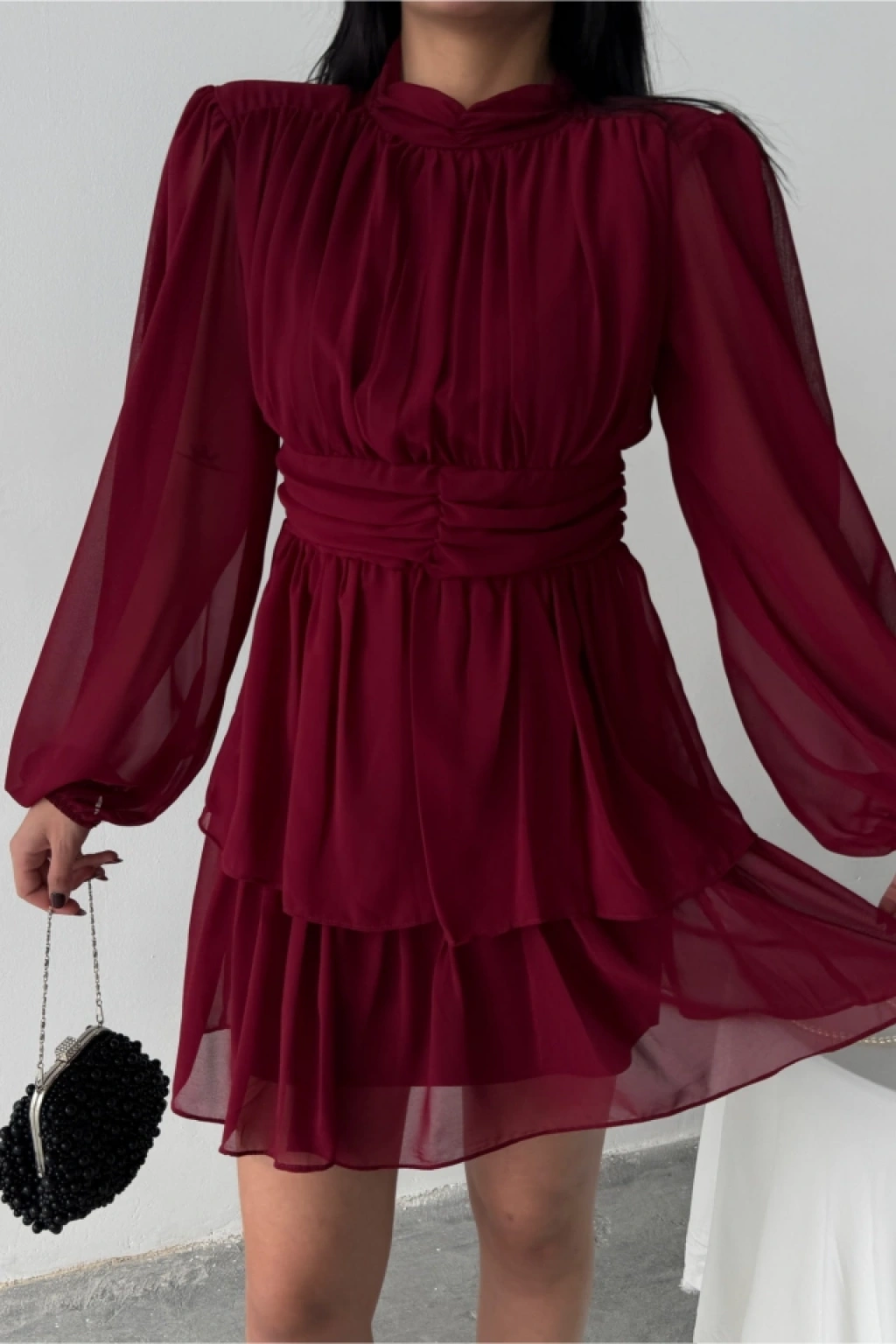 ŞİFON KATLI UZUN KOL ELBİSE - Bordo