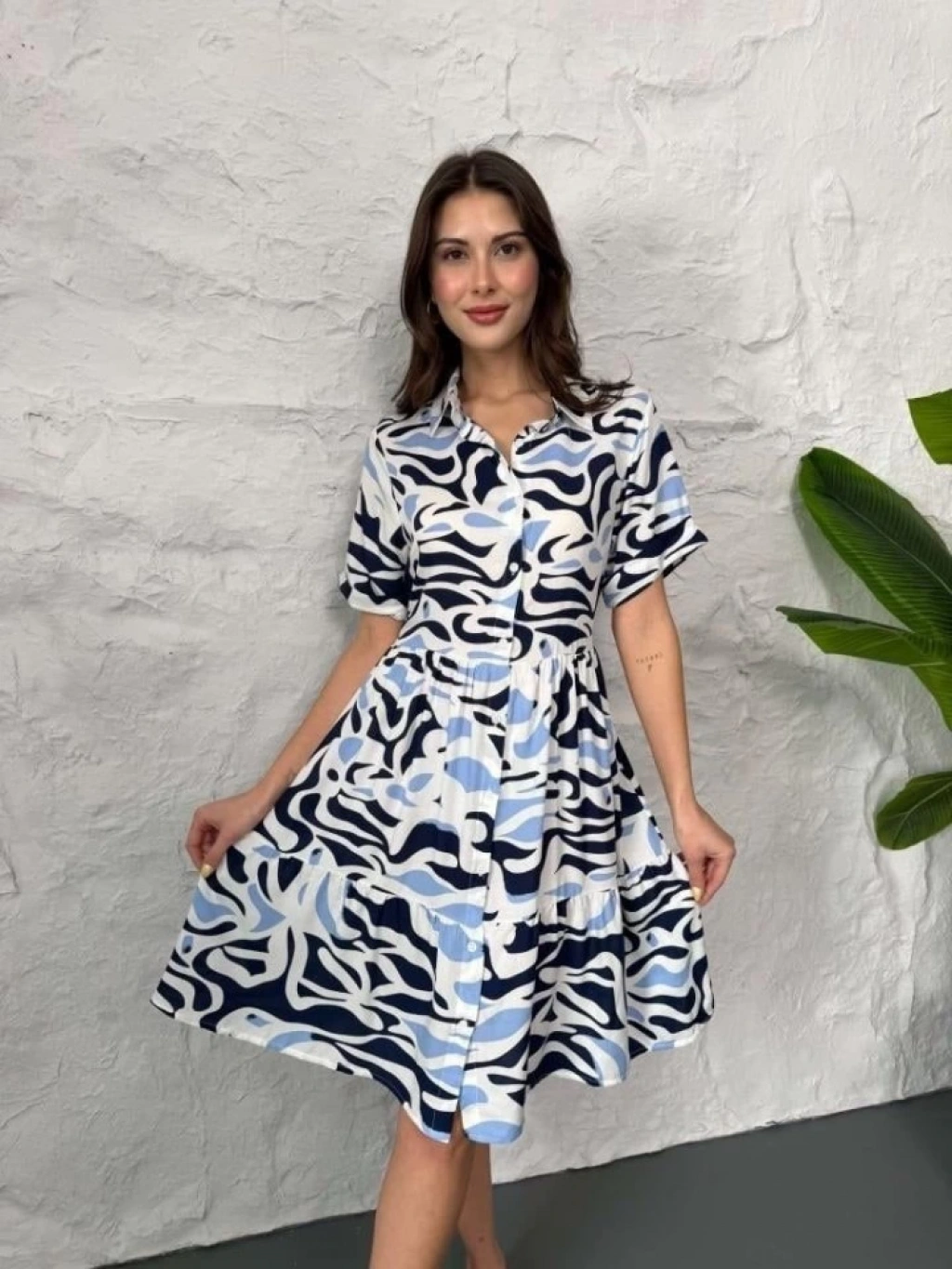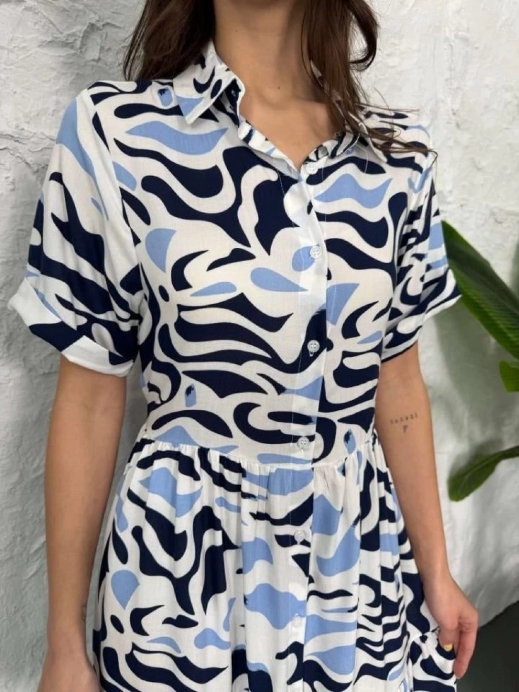Baskılı Keten Elbise - Lacivert