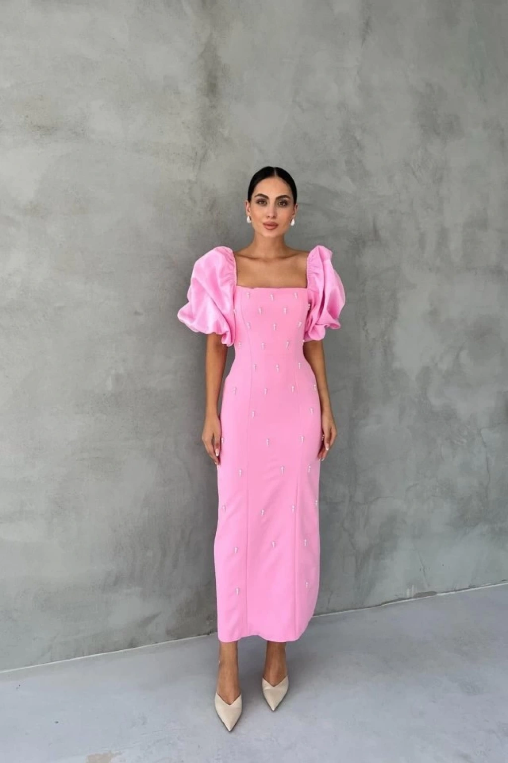 Pembe İşlemeli Kolu Garnili Elbise