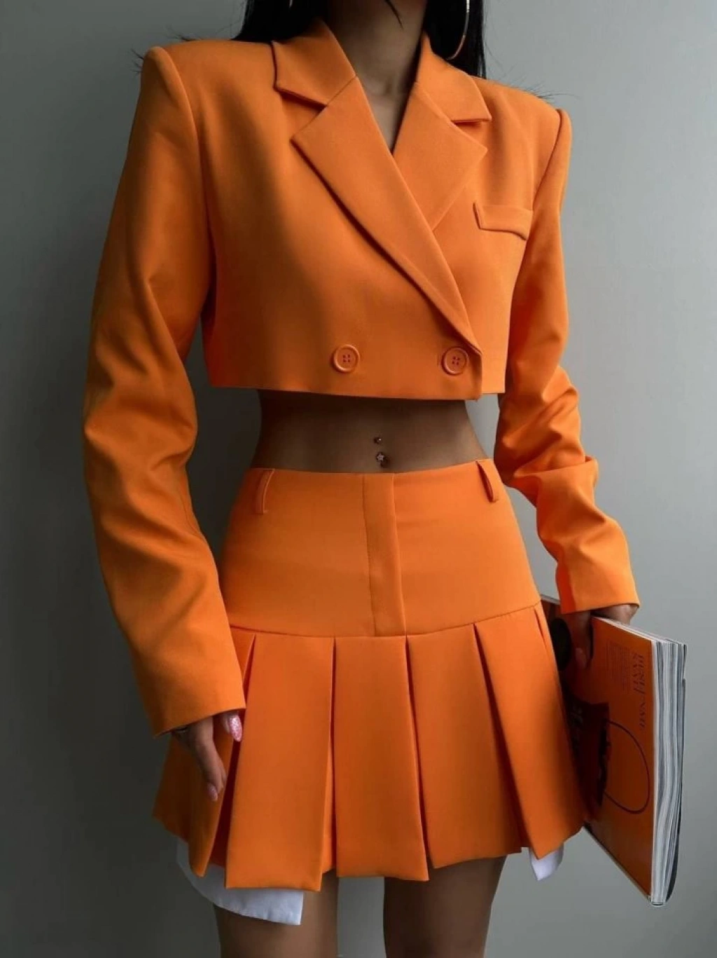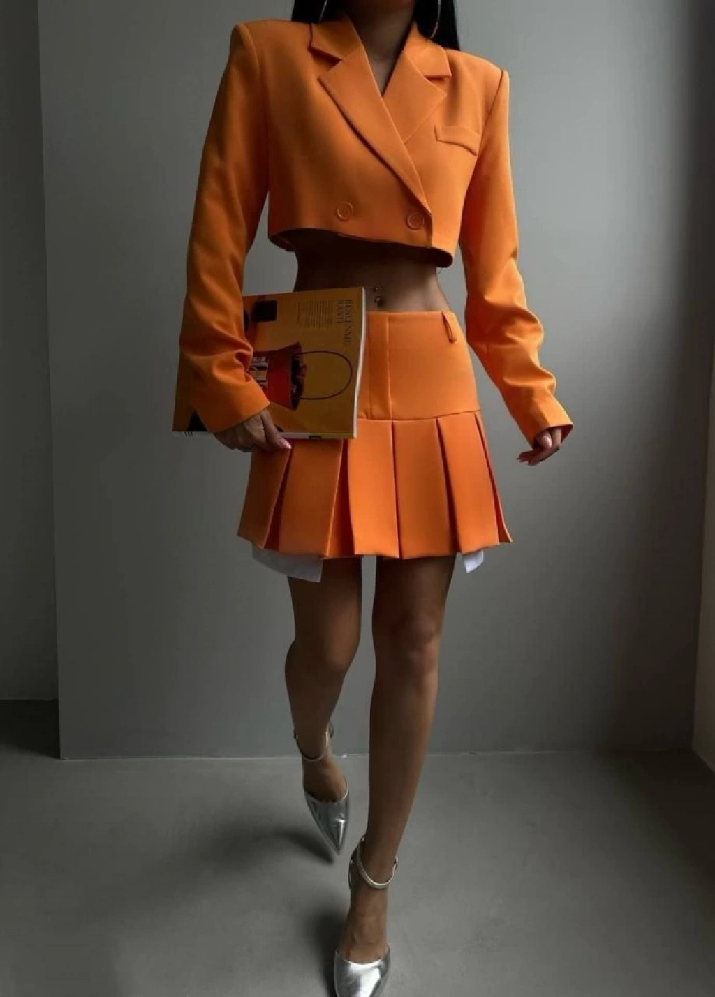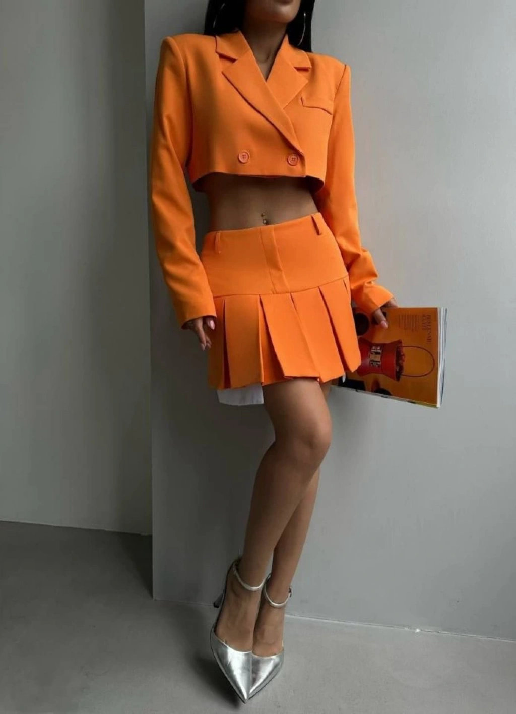 Pileli Etek Crop Ceket Takım