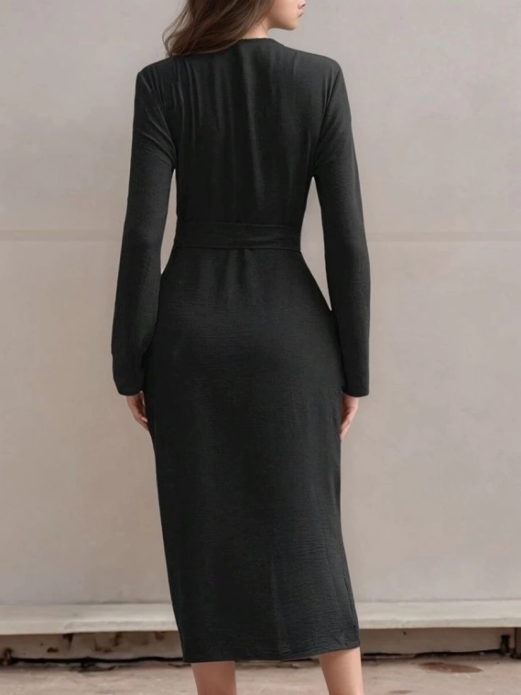 Kadın Uzun Kollu önden Düğmeli Beli Kuşaklı Aerobin Midi Elbise