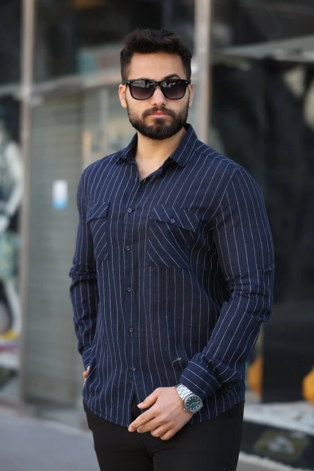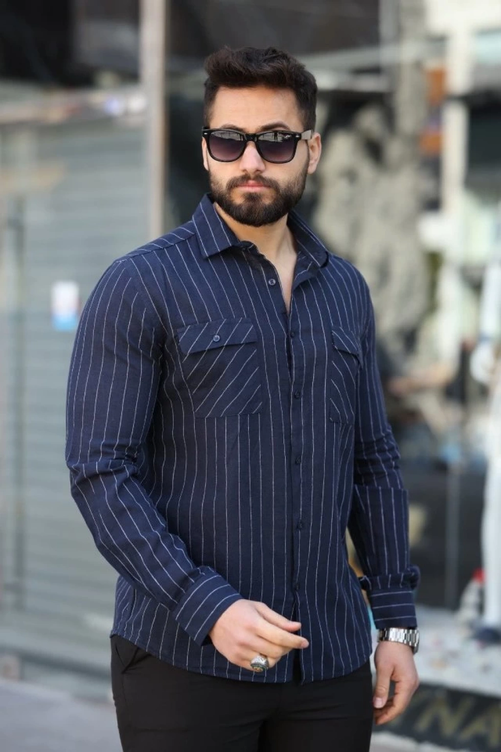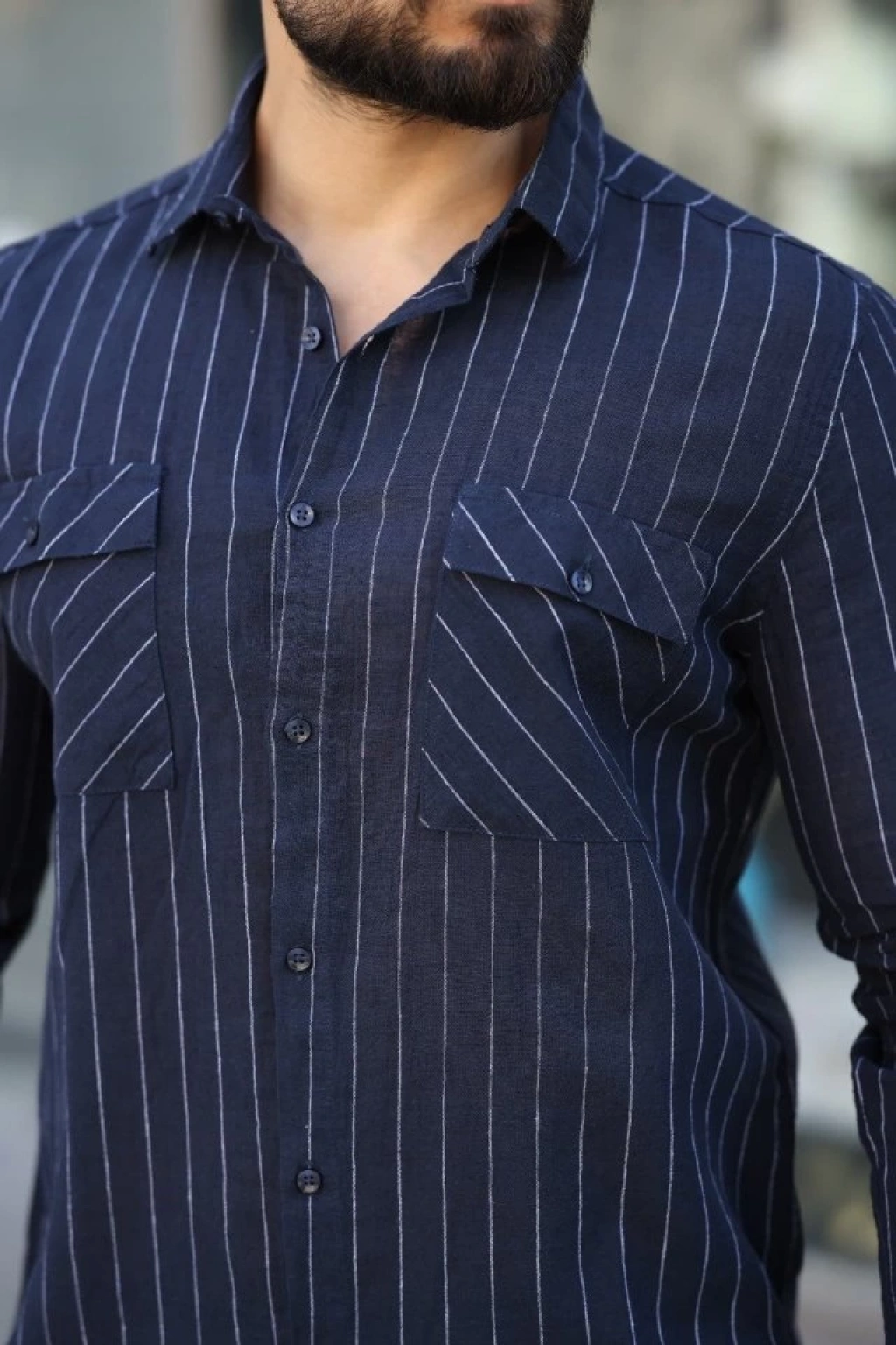 Erkek Pamuklu Çizgi Desenli Cep Detaylı Gömlek
