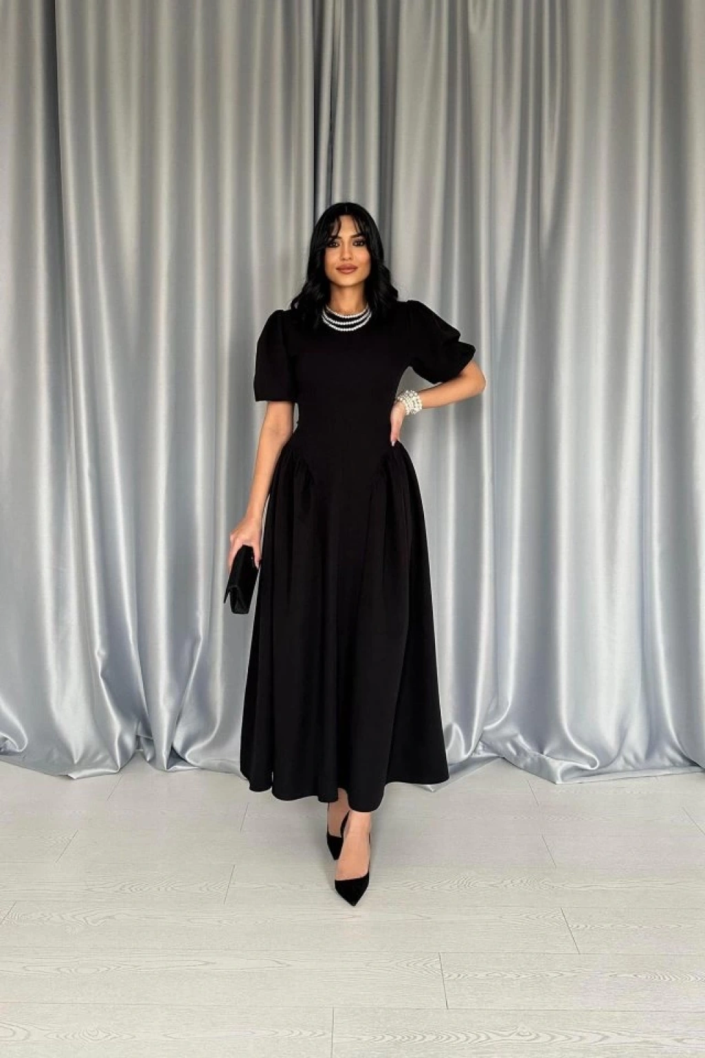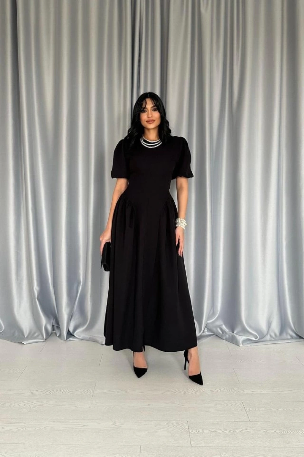 Siyah Etek Yanları Büzgülü Balon Kollu Elbise