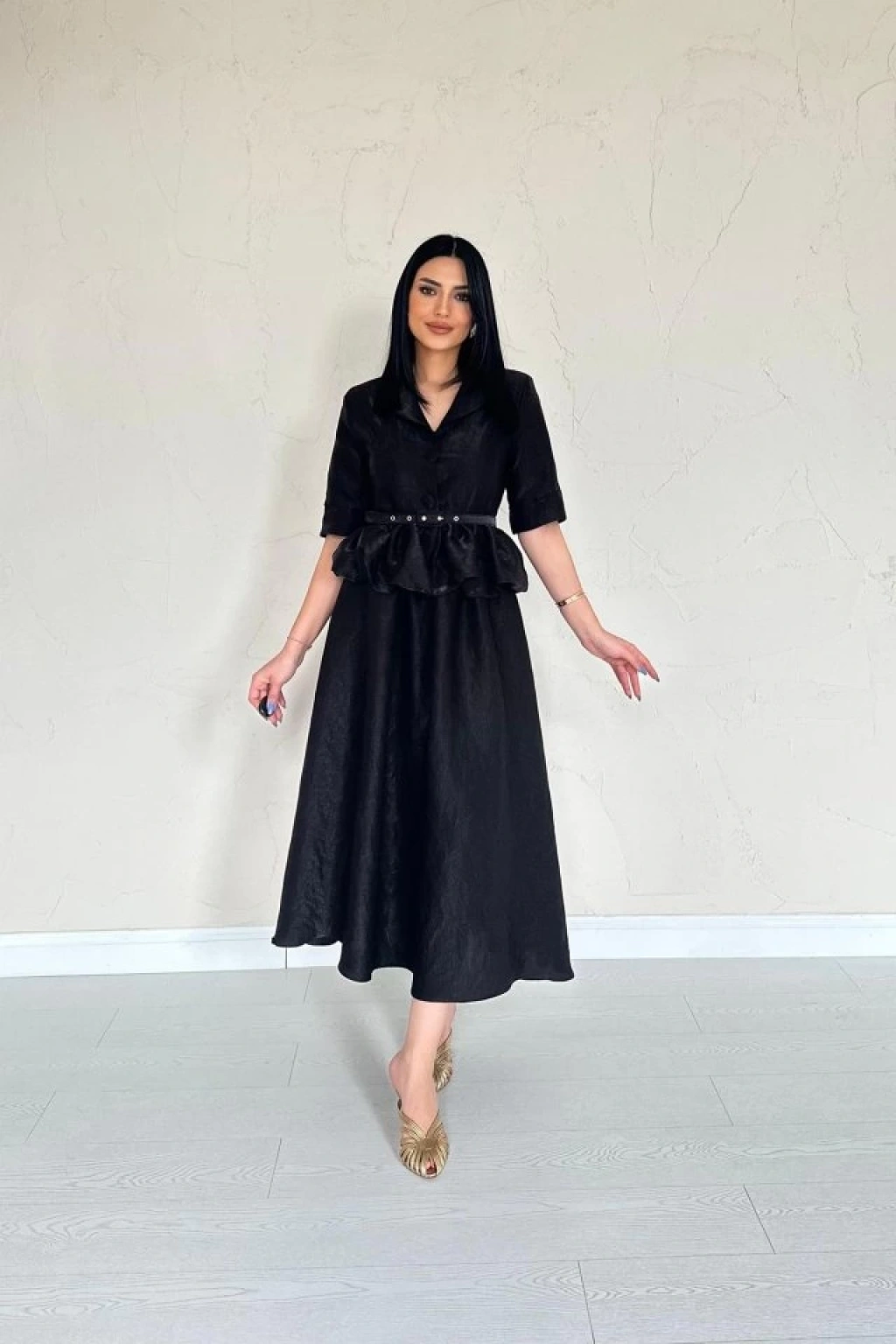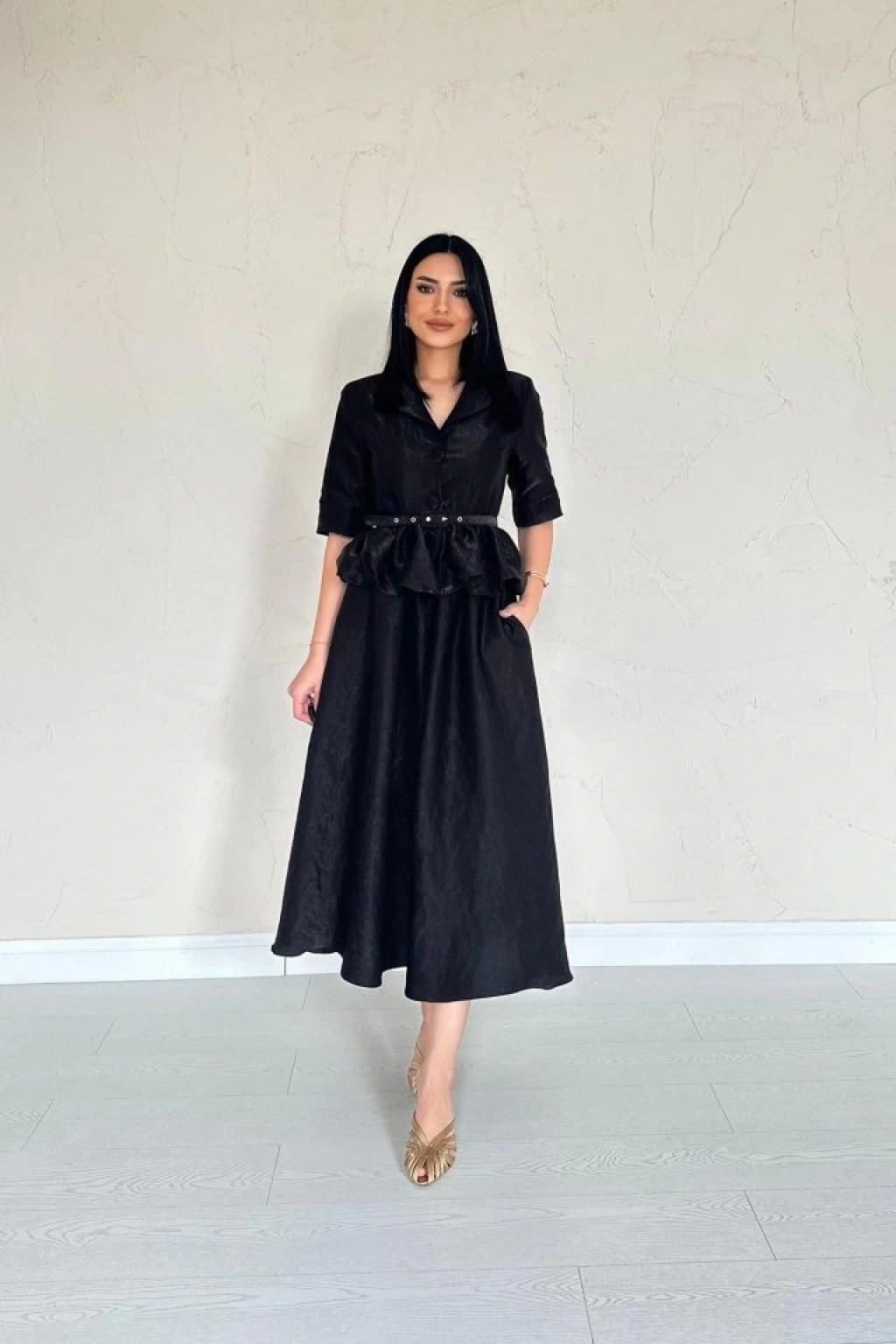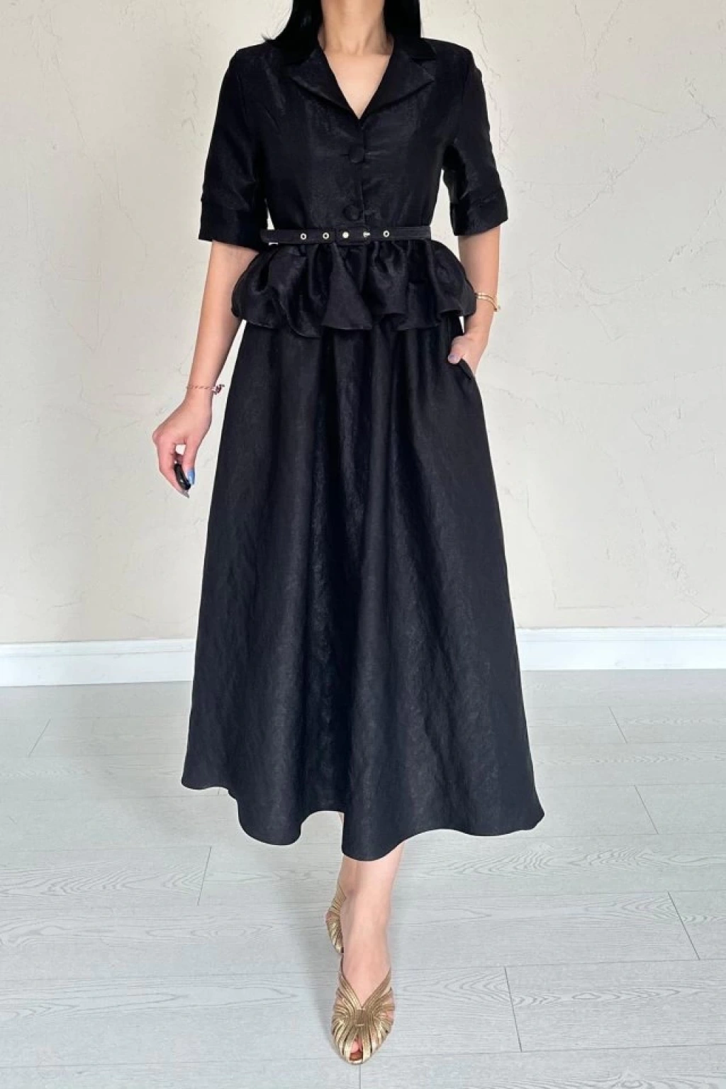 Siyah İnce Kemerli Fırfırlı Ceket Ve Büzgülü Etek Takım