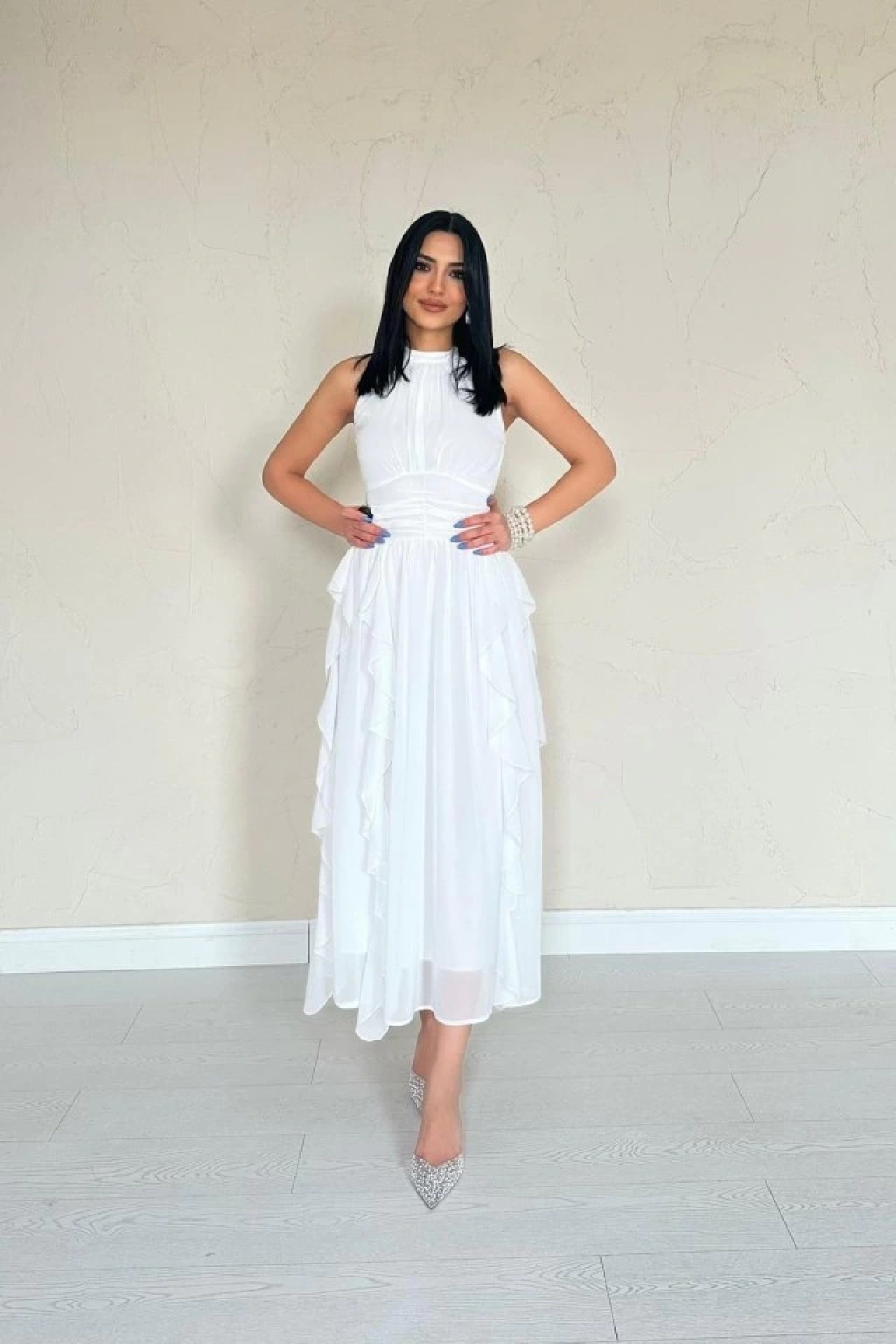 Beyaz Önü Büzgülü Fırfırlı Elbise