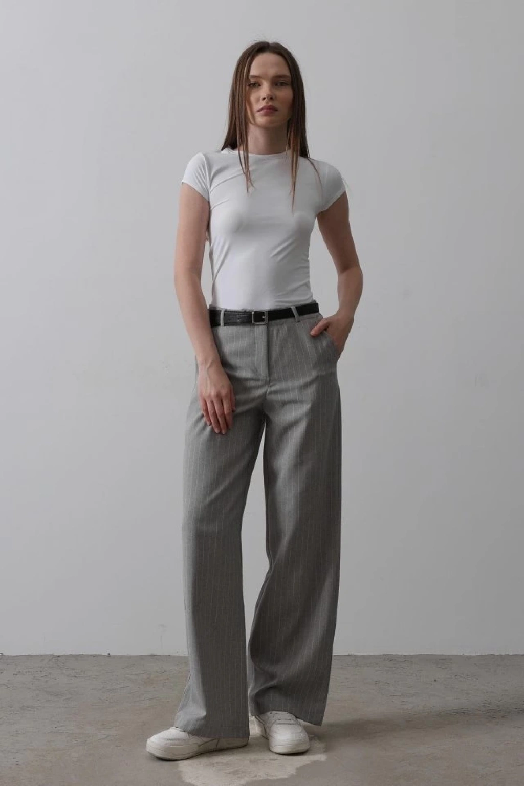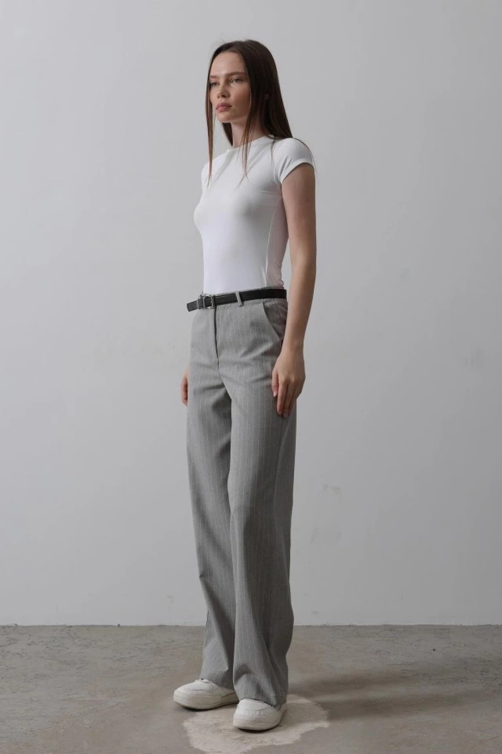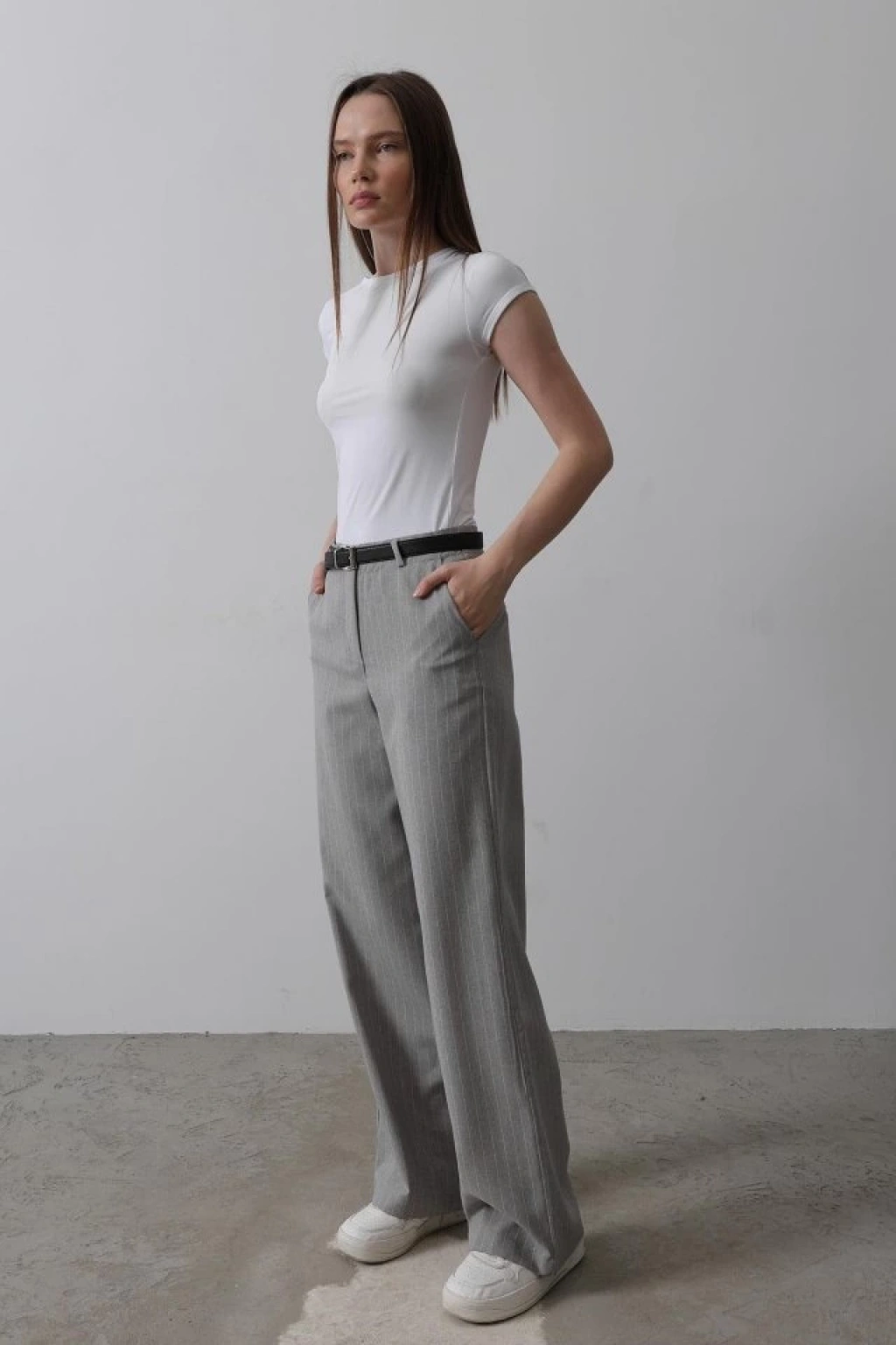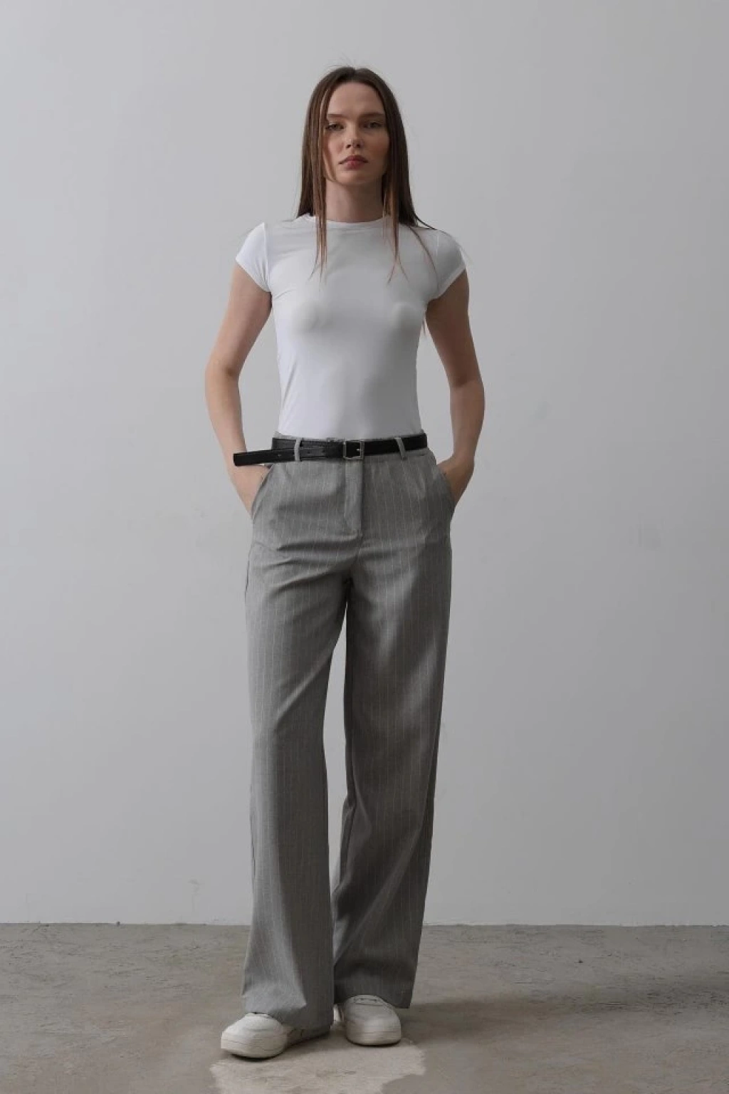 Kemerli Palazzo Pantolon - Gri-Beyaz