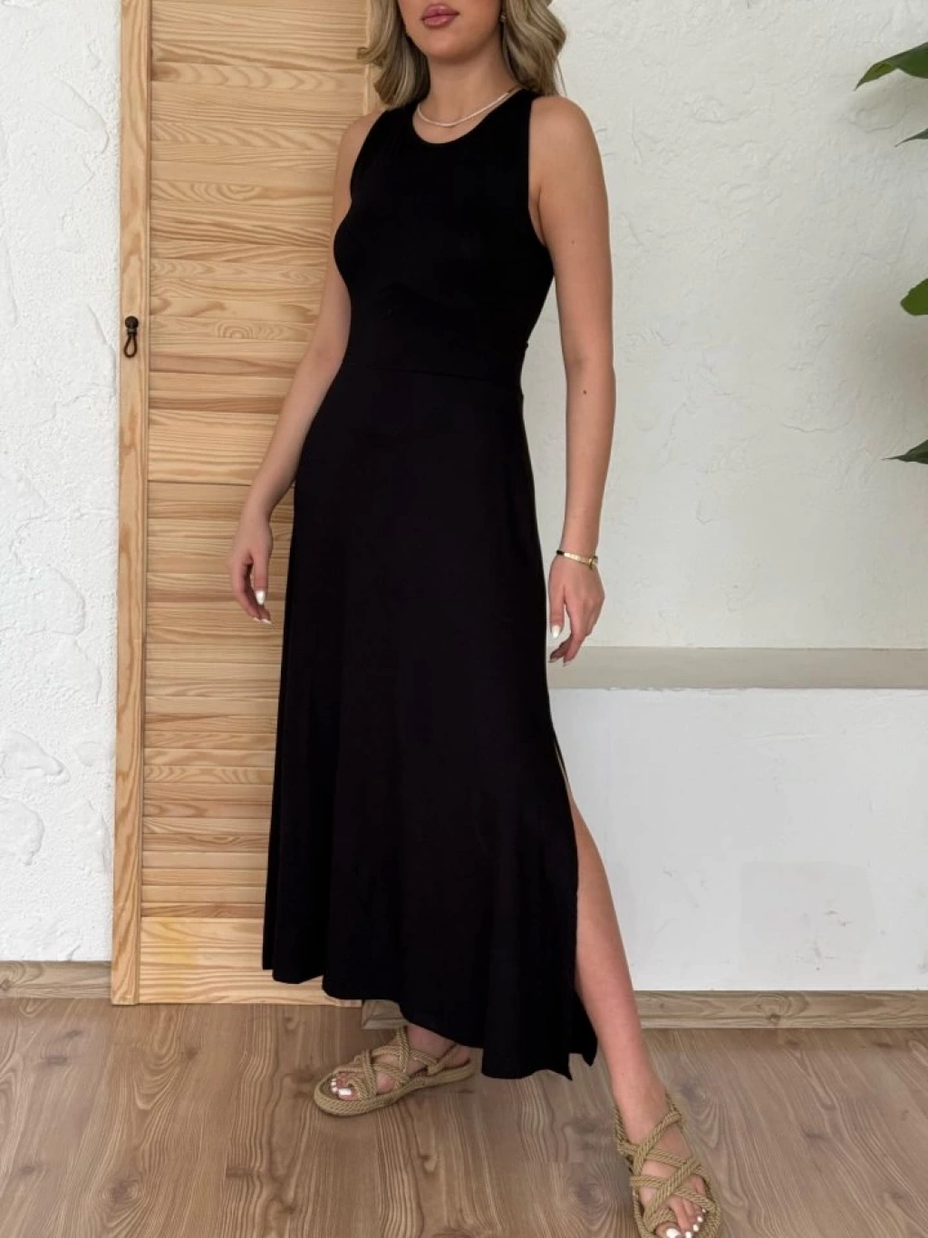 Kadın Arkadan çapraz Detay Yuvarlak Yaka Maksi Viskon Elbise