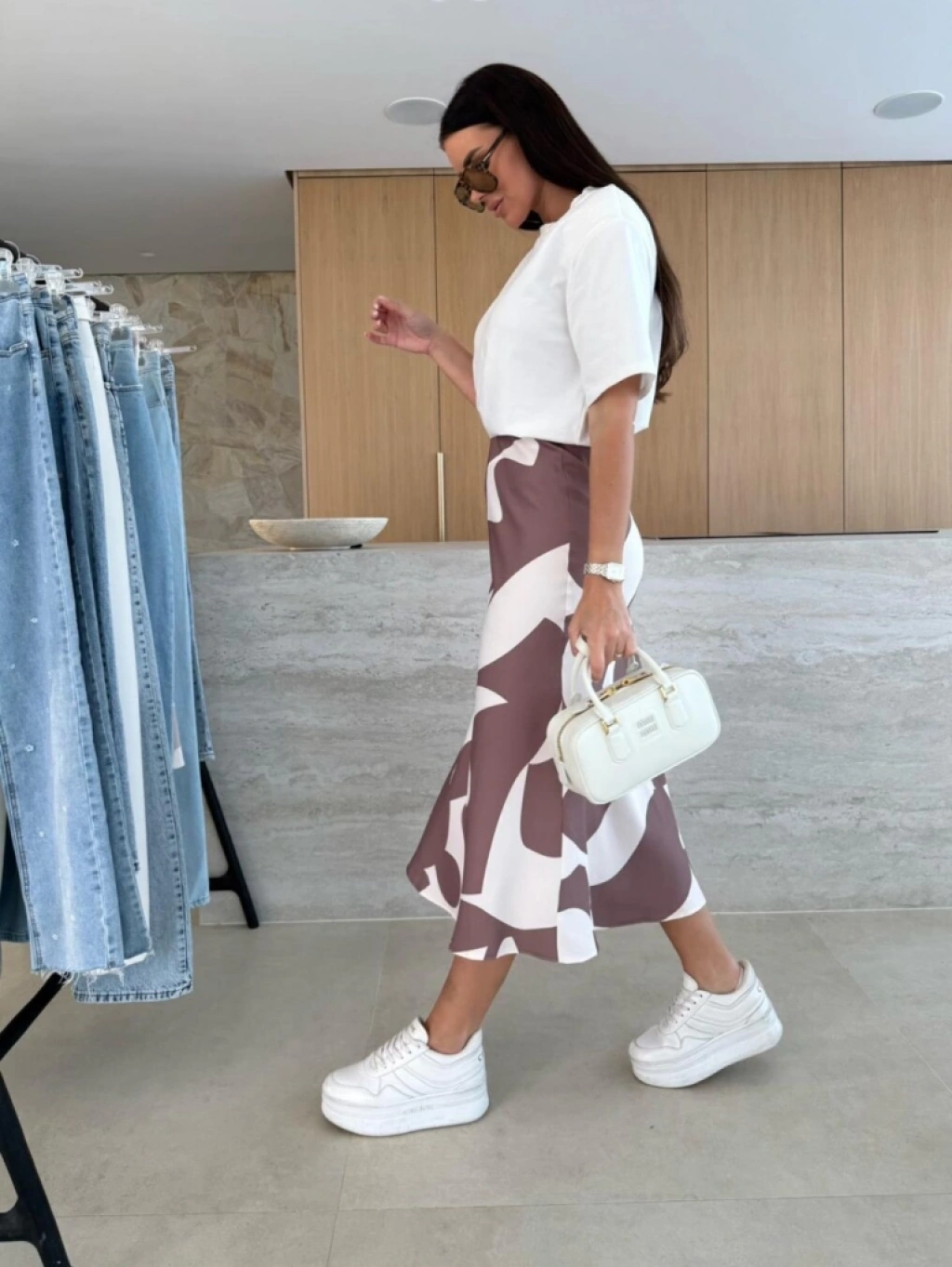 Kadın Kısa Kollu Bisiklet Yaka Viskon Bluz Ve Desenli Süprem Etek Ikili Takım