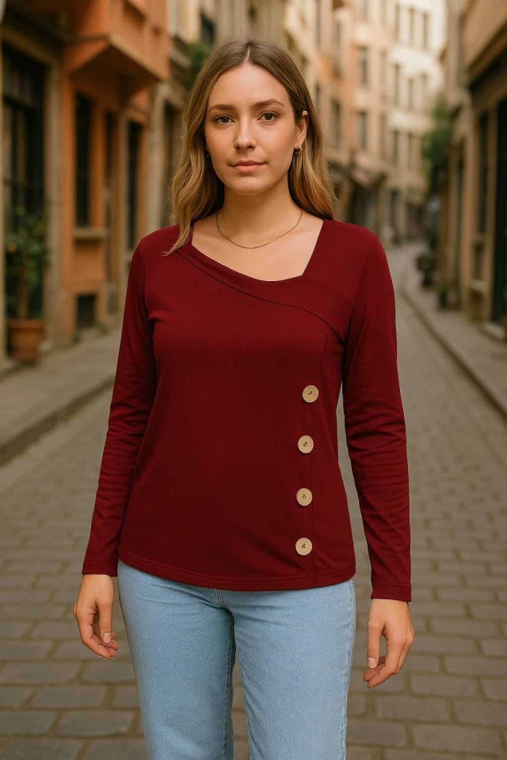 Kadın Uzun Kollu Geometrik Yaka Detay Yandan Düğmeli Viskon Iki Iplik Bluz