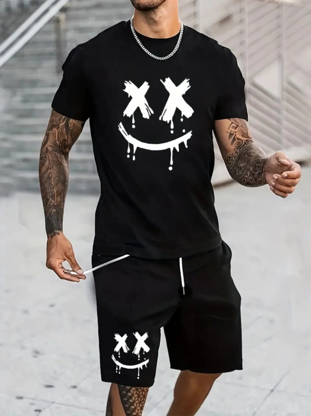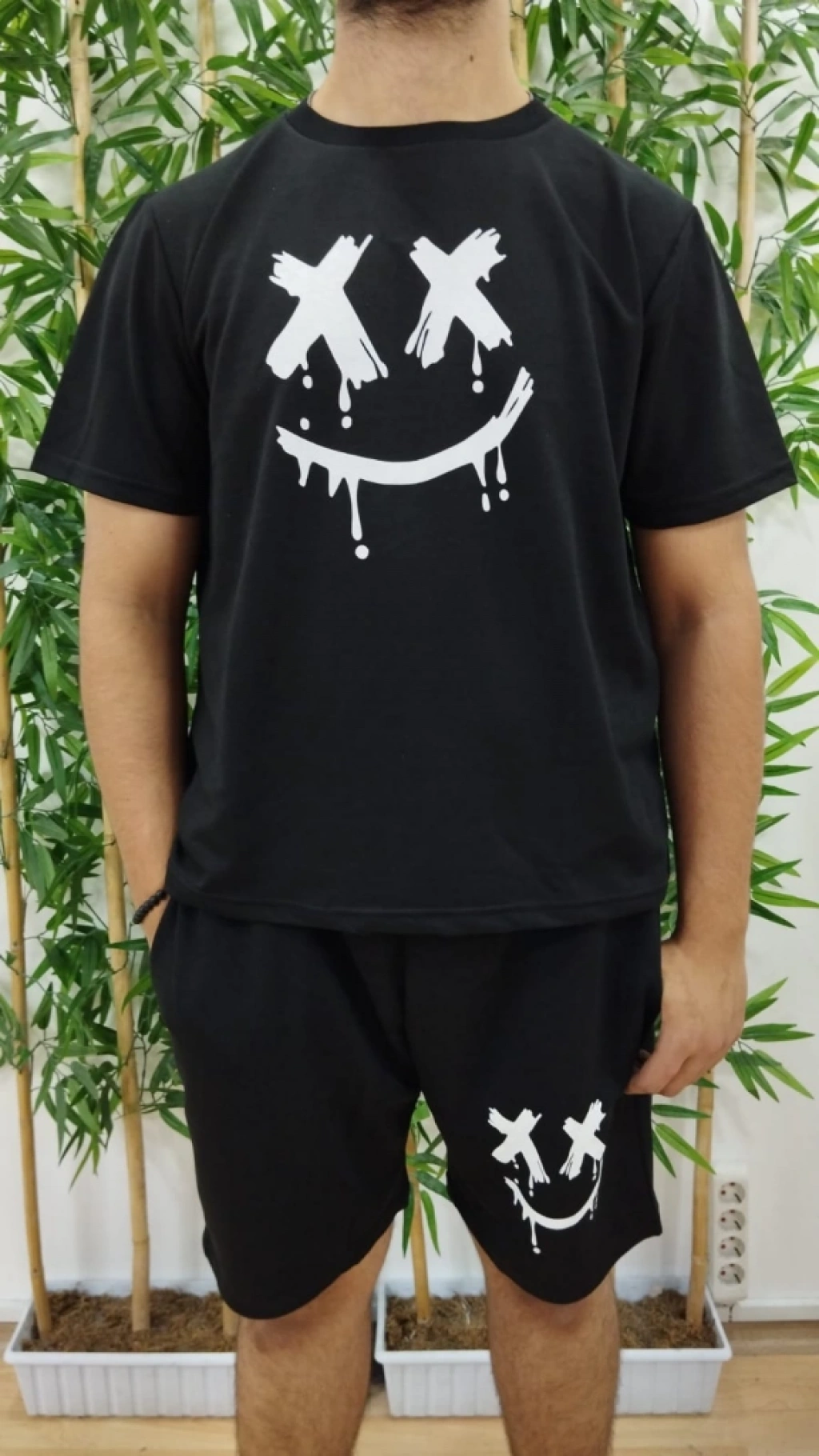 Erkek Kısa Kollu Bisiklet Yaka Baskılı Bluz Ipli Short Iki Iplik Takım