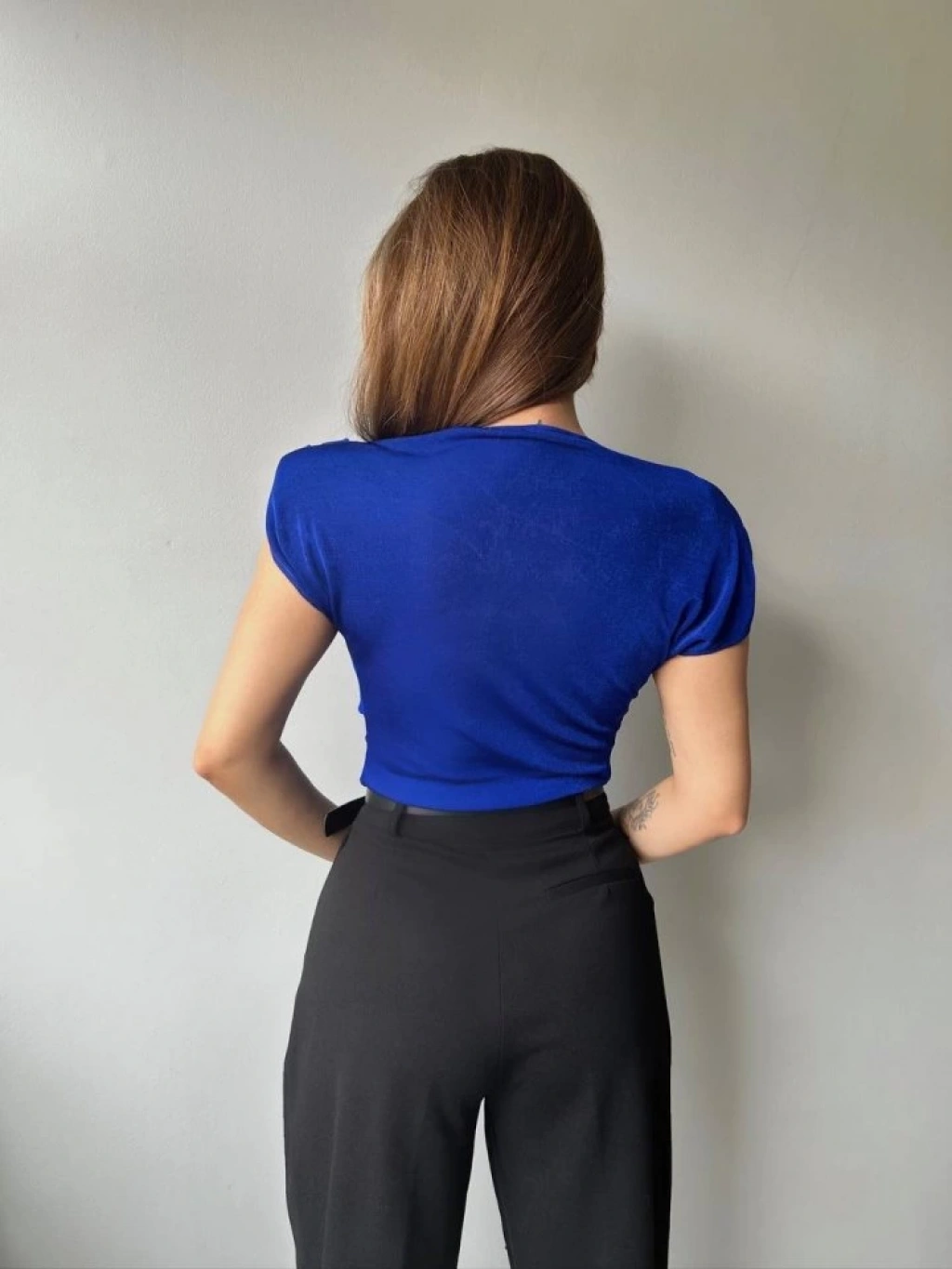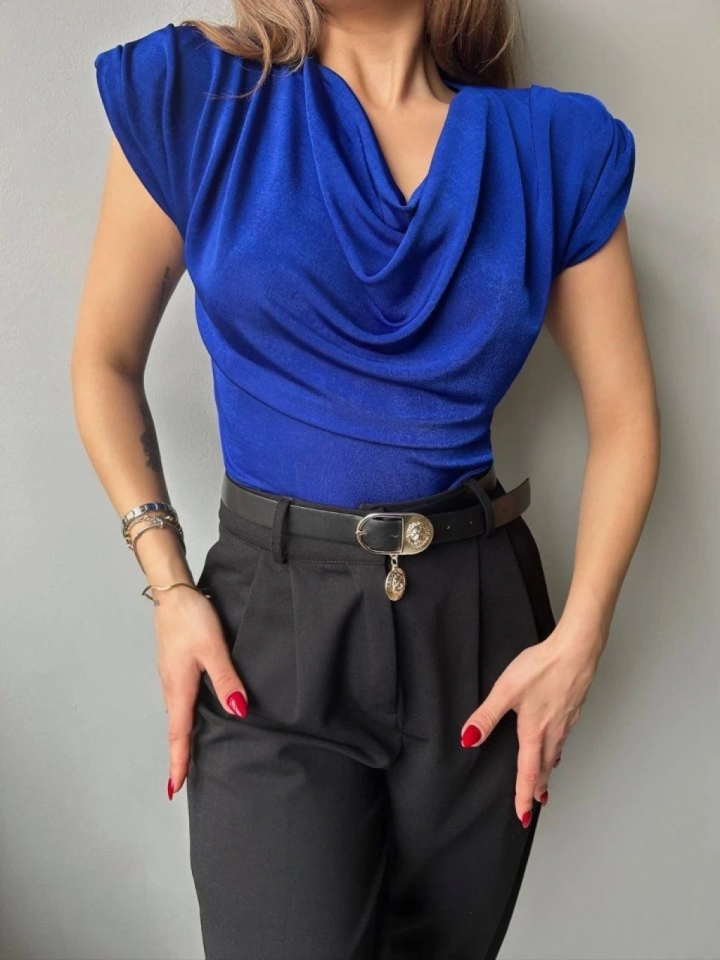 Kadın V Yaka Vatka Detay Kolsuz Dökümlü Bluz