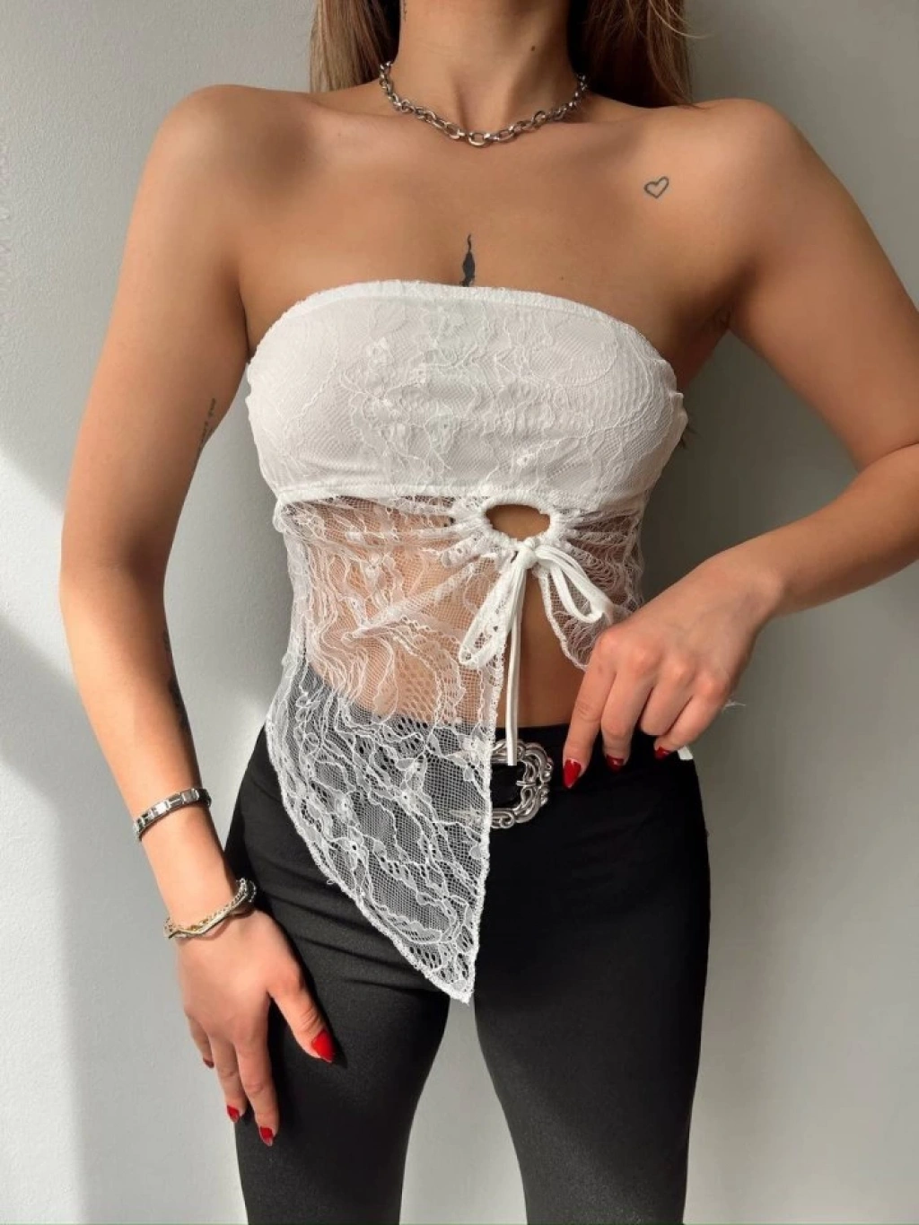 Kadın Göğüs Ve Sırt Dekolteli Transparan Dantel Detay Bluz