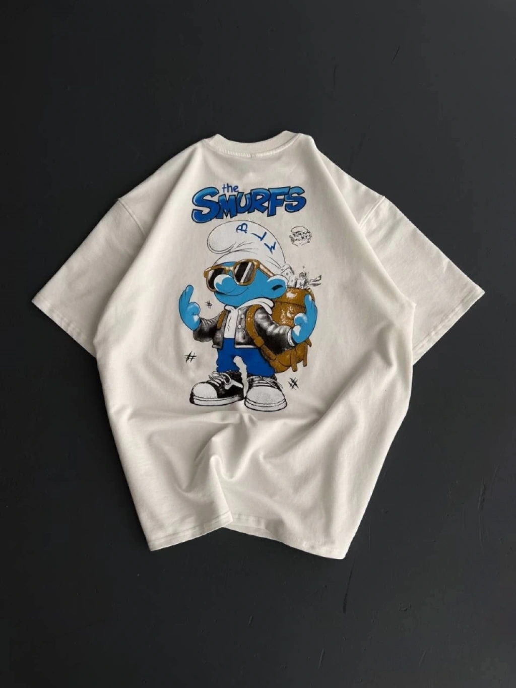 Ön Ve Arka Baskılı Oversize Bisiklet Yaka T-shirt- Beyaz