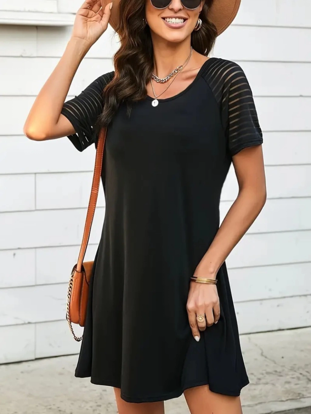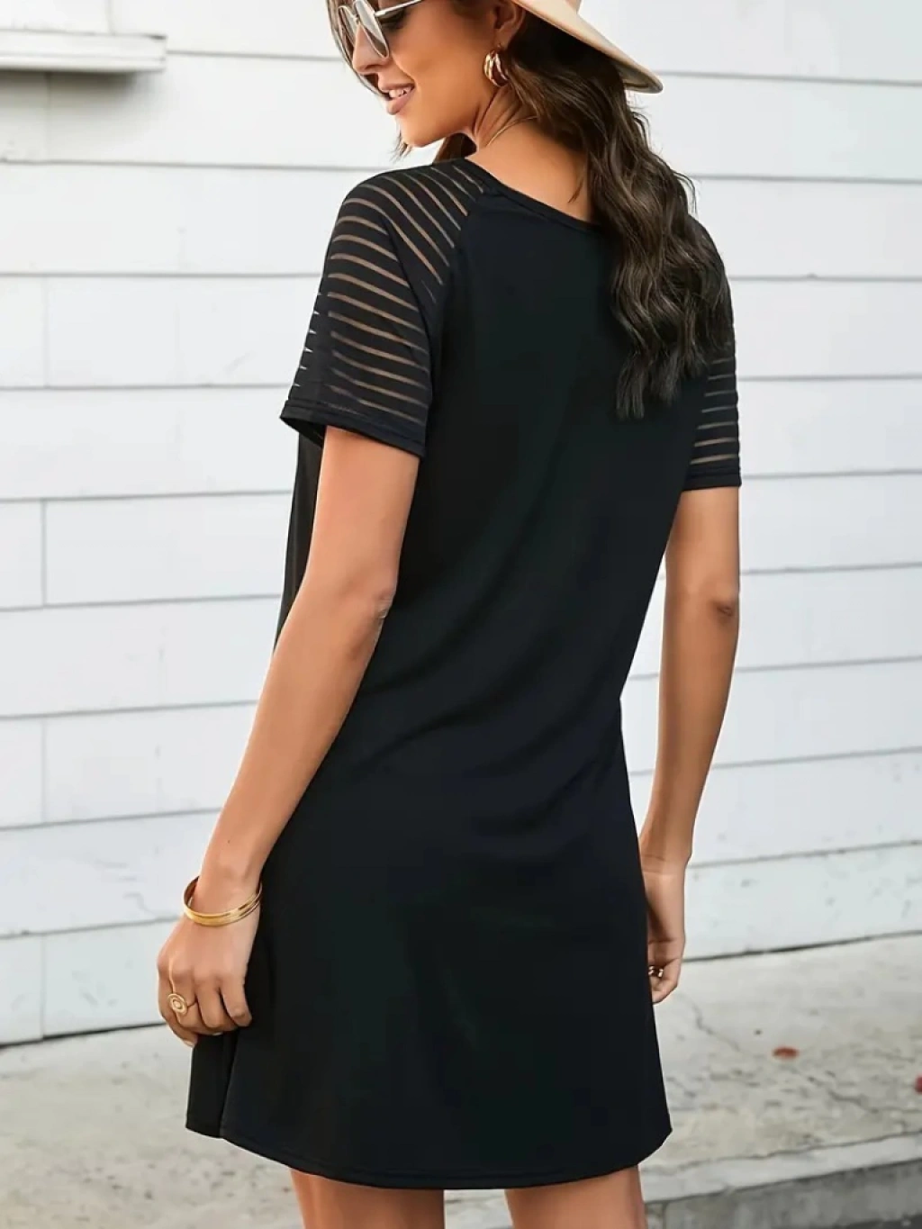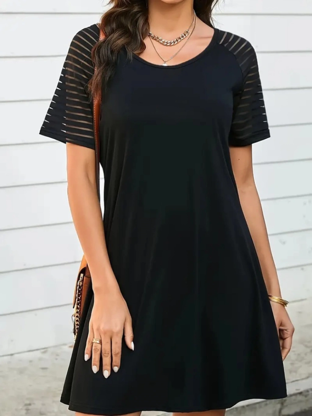 Kadın Kısa Kollu Yuvarlak Yaka şerit Kol Detaylı Viskon Elbise
