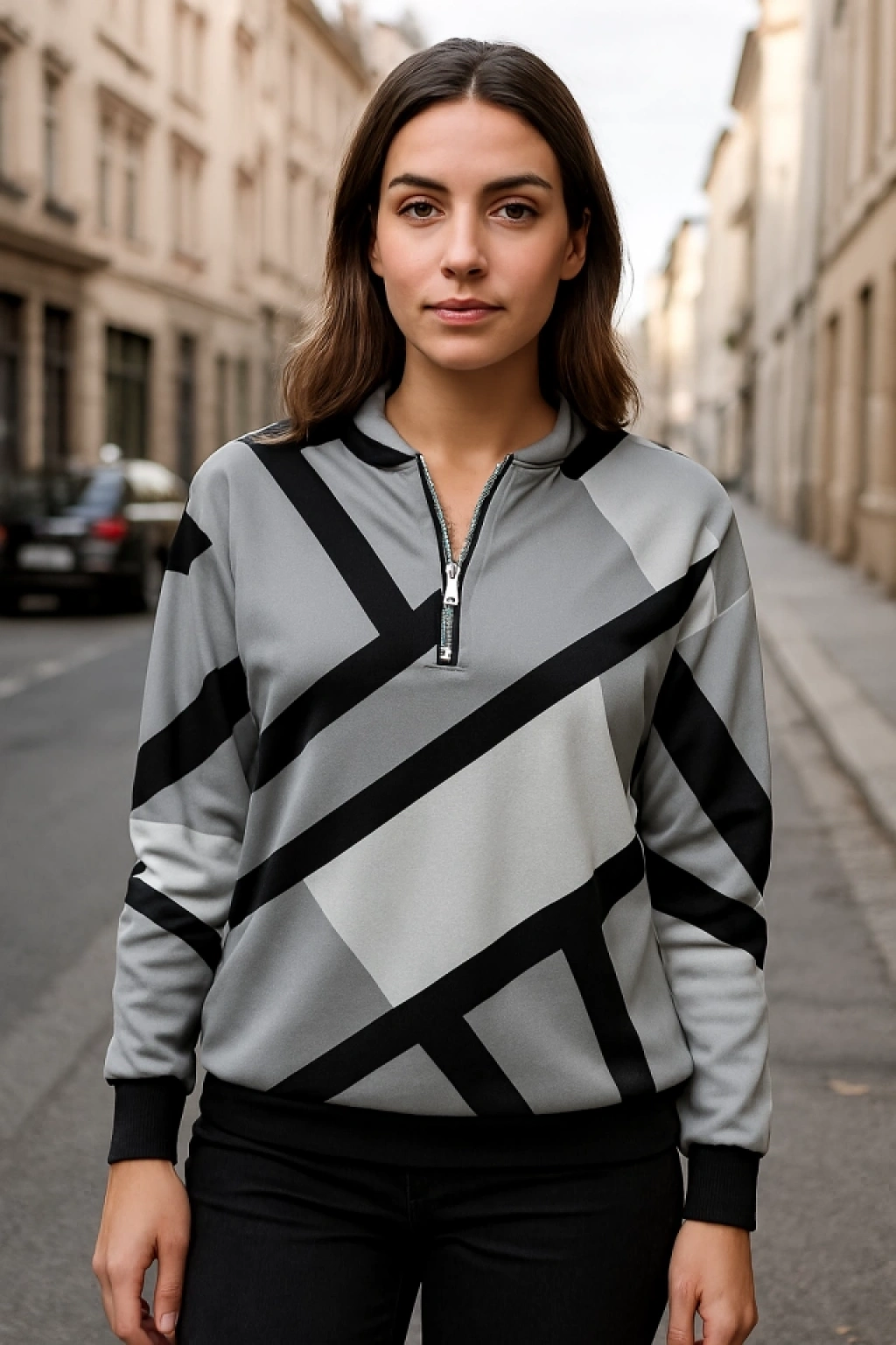 Kadın Uzun Kollu Yuvarlak Yaka Fermuarlı Desenli şardonlu Bluz