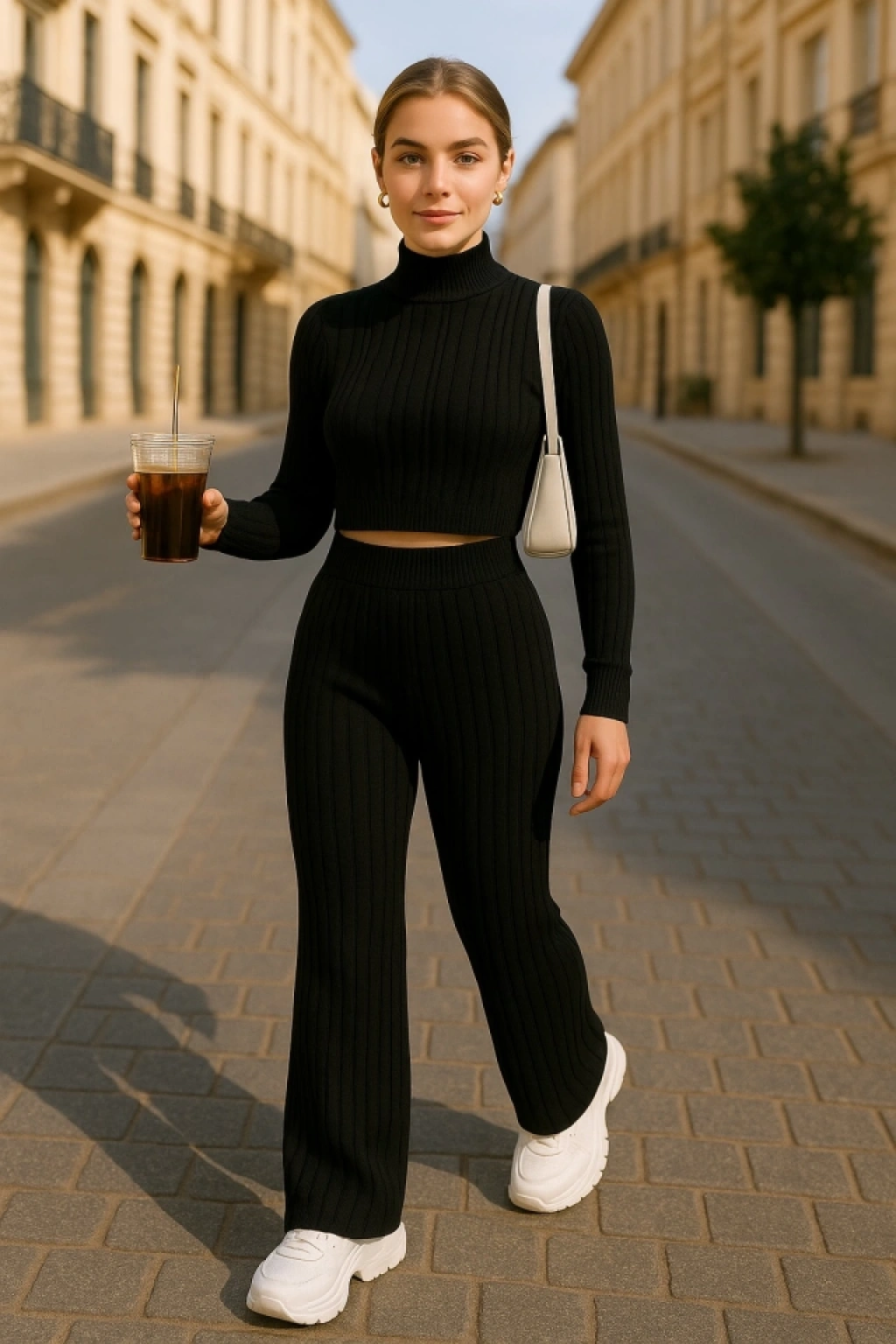 Kadın Uzun Kollu Balıkçı Yaka Krop Ve Pantolon şardonlu Kaşkorse Ikili Takım