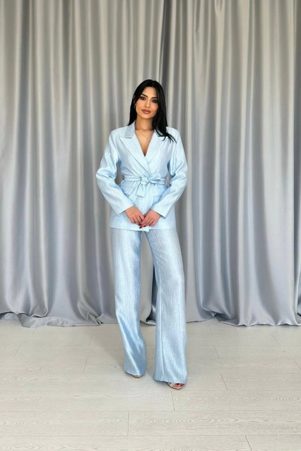 Mavi Beli Kuşaklı Ceket Ve Pantolon Parlak Takım