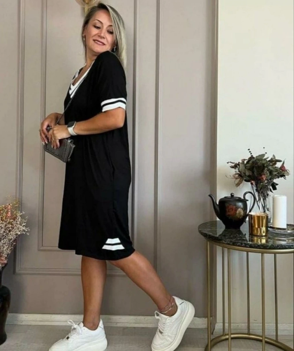 Kadın Kısa Kollu V Yaka Ribana Detaylı Cepli Dizüstü Viskon Elbise