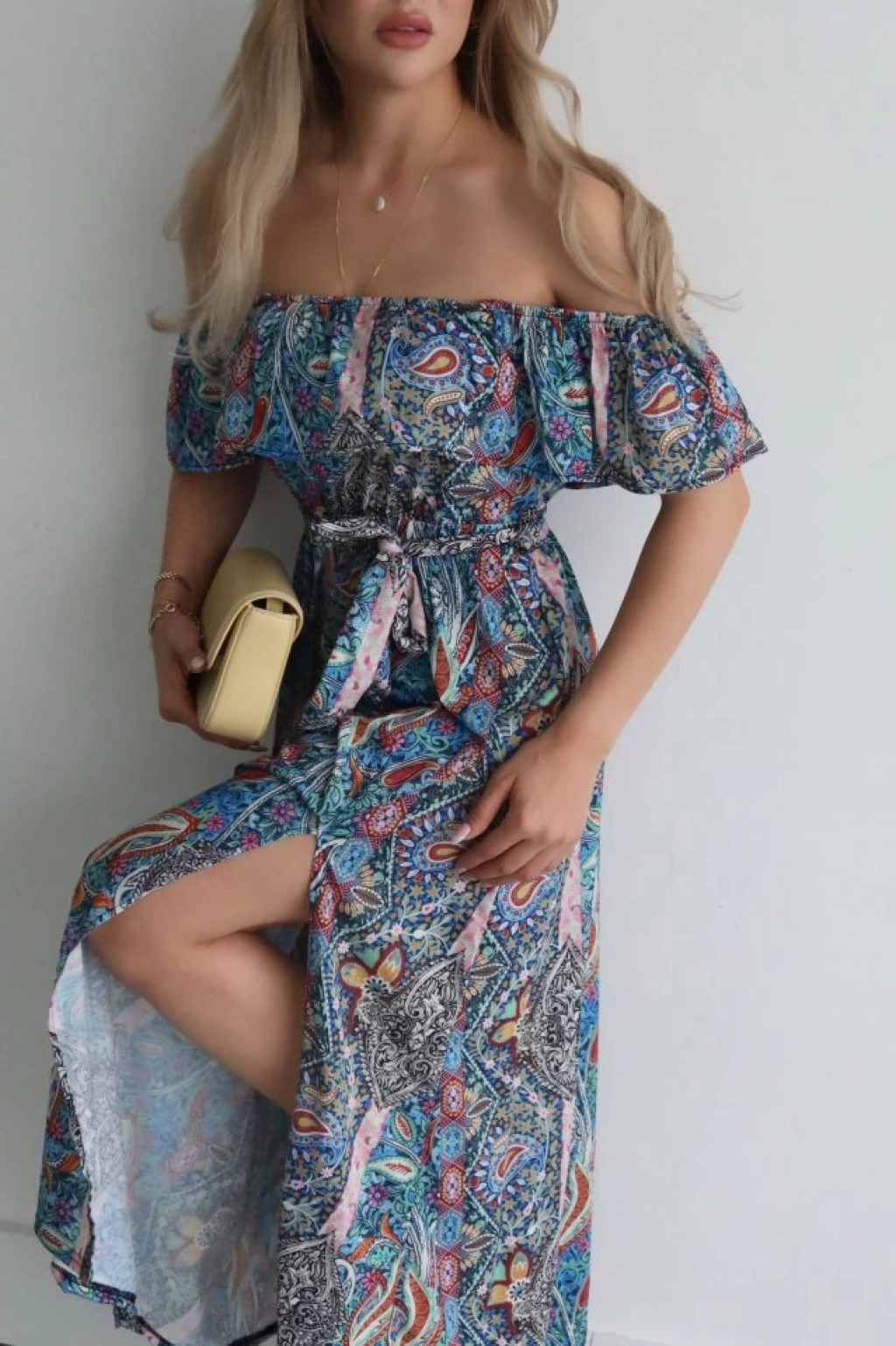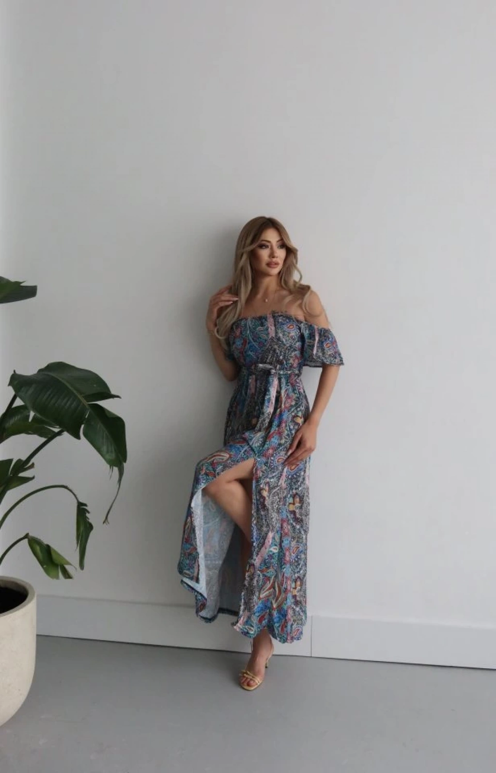 Kadın Kısa Kollu Madonna Yaka Fırfırlı Belden Yırtmaçlı Maksi Süprem Elbise