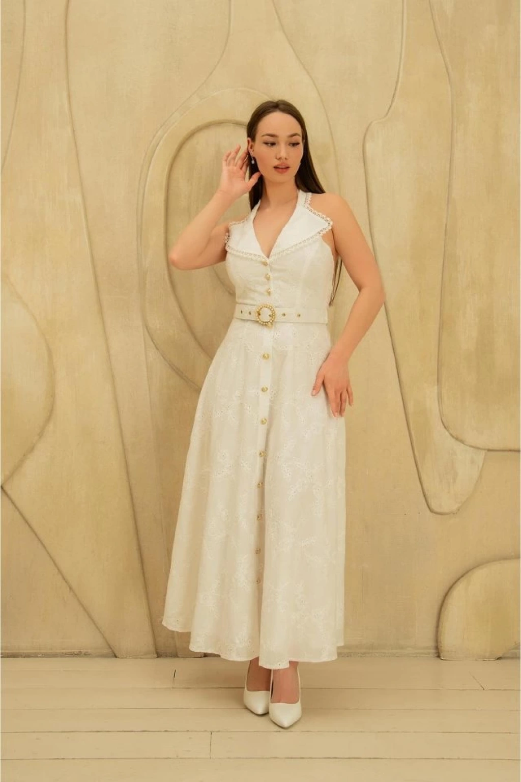 Beyaz İnci Kemer Detaylı Dantelli Elbise