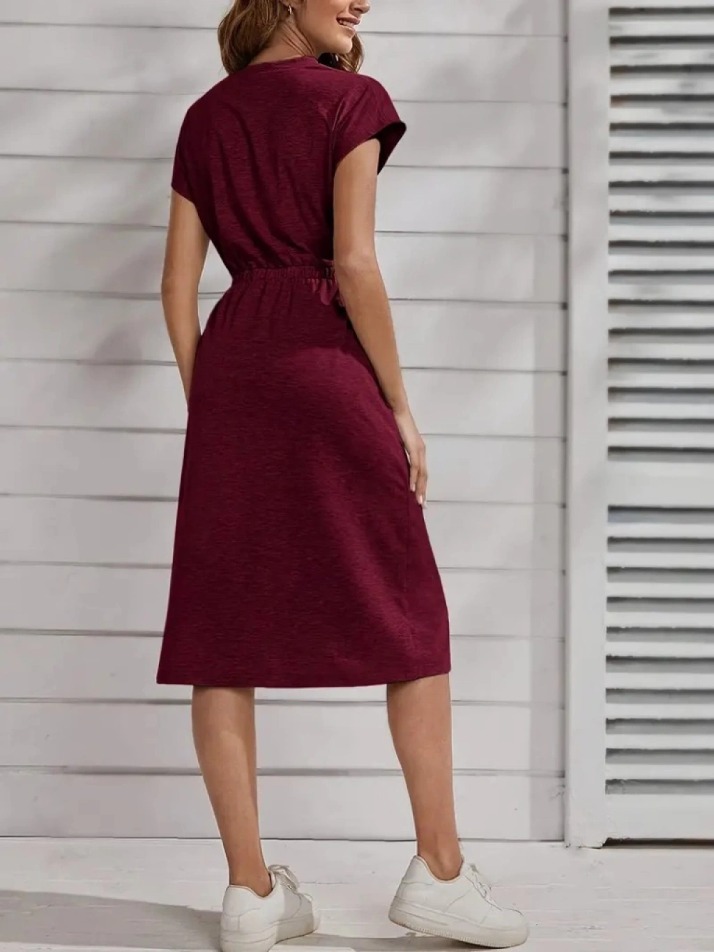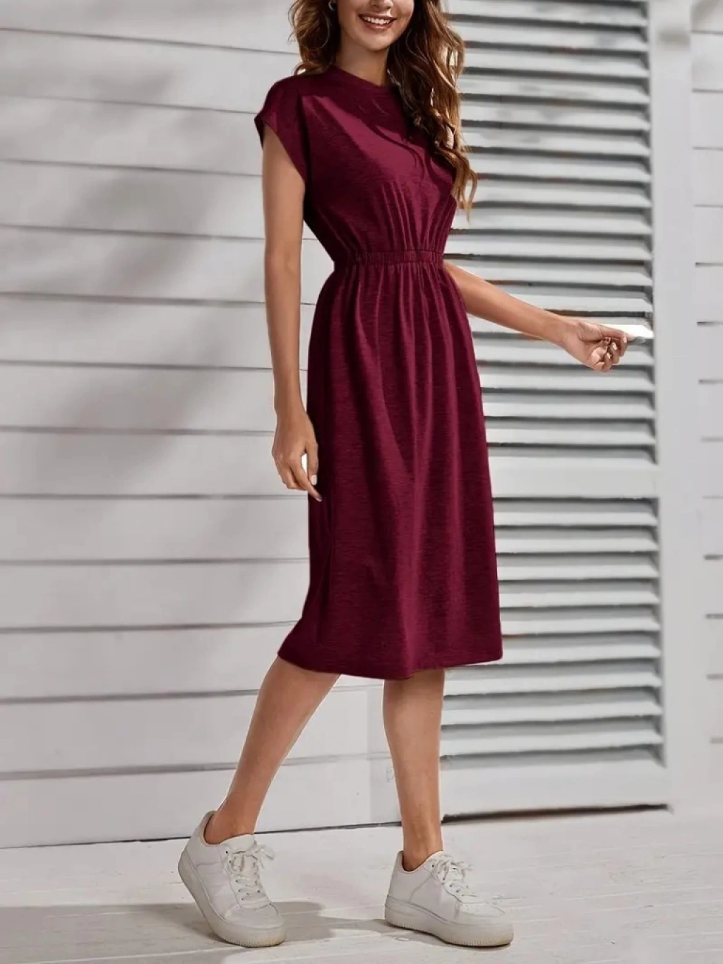 Kadın Kısa Kollu Bisiklet Yaka Belden Lastikli Midi Viskon Elbise