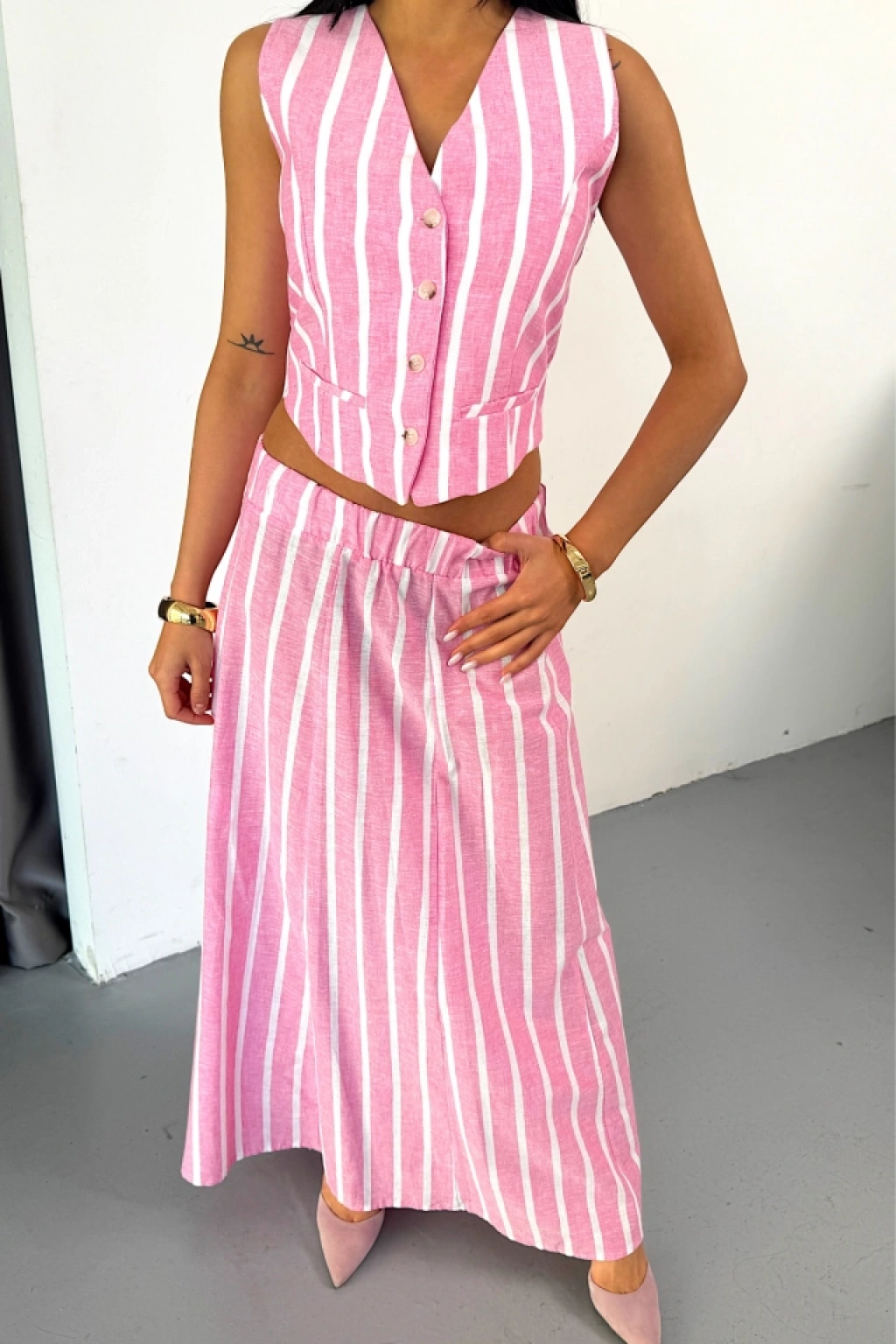 KETEN ÇİZGİLİ YELEK - UZUN ETEK TAKIM - Pembe