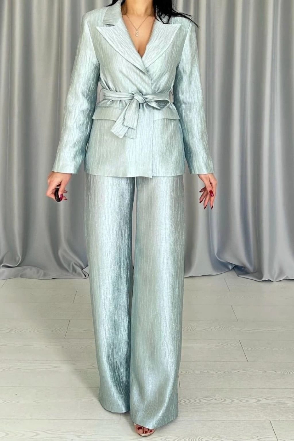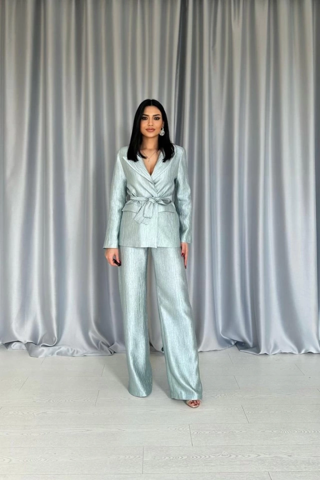 Mint Beli Kuşaklı Ceket Ve Pantolon Parlak Takım