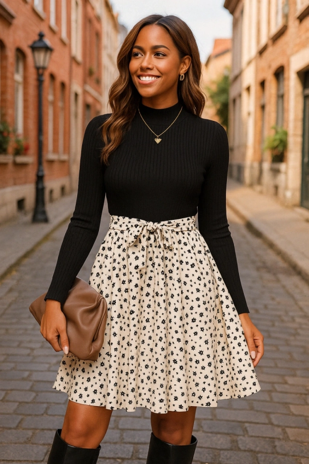 Kadın Uzun Kollu Balıkçı Yaka Belden Bağlamalı üst Kaşkorse Eteği Dalgıç Kısa Elbise