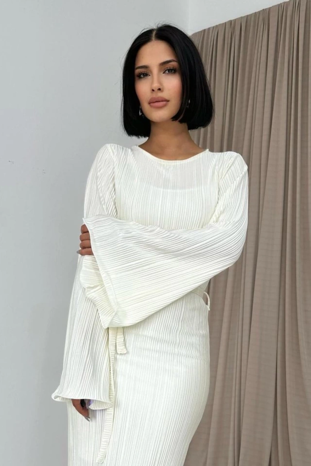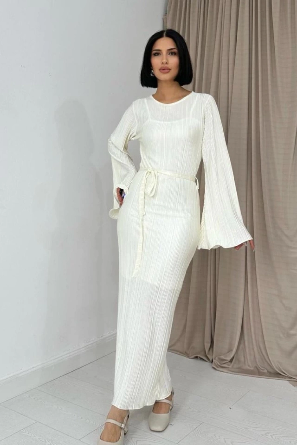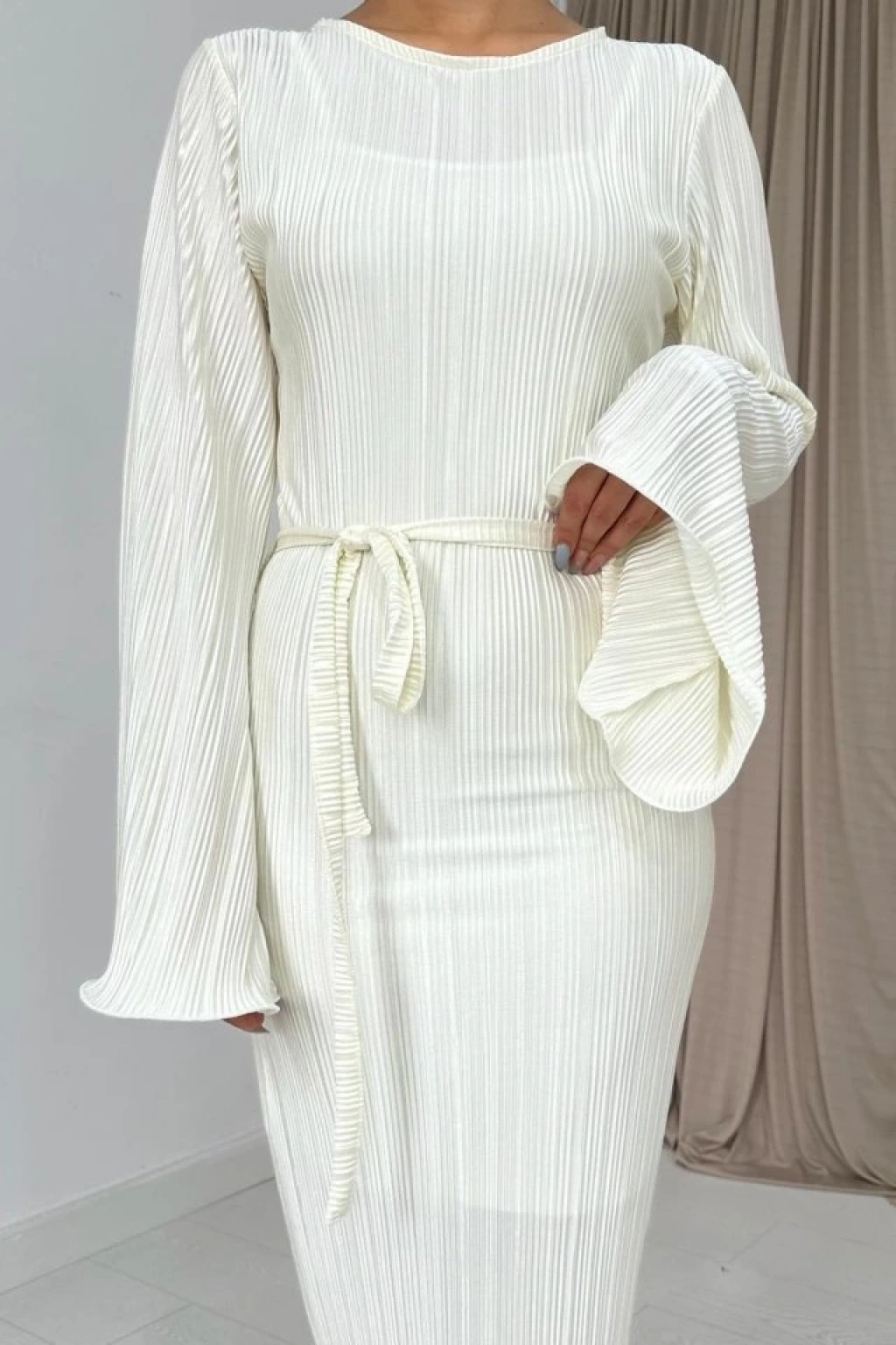 Ekru İspanyol Kol Piliseli Elbise