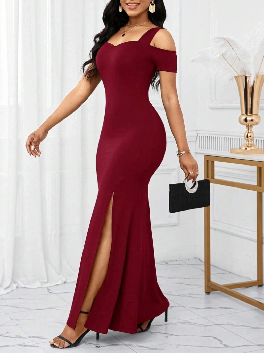 Kadın Omuzlardan Açık Askılı Yırtmaç Detaylı Uzun Ithal Krep Elbise