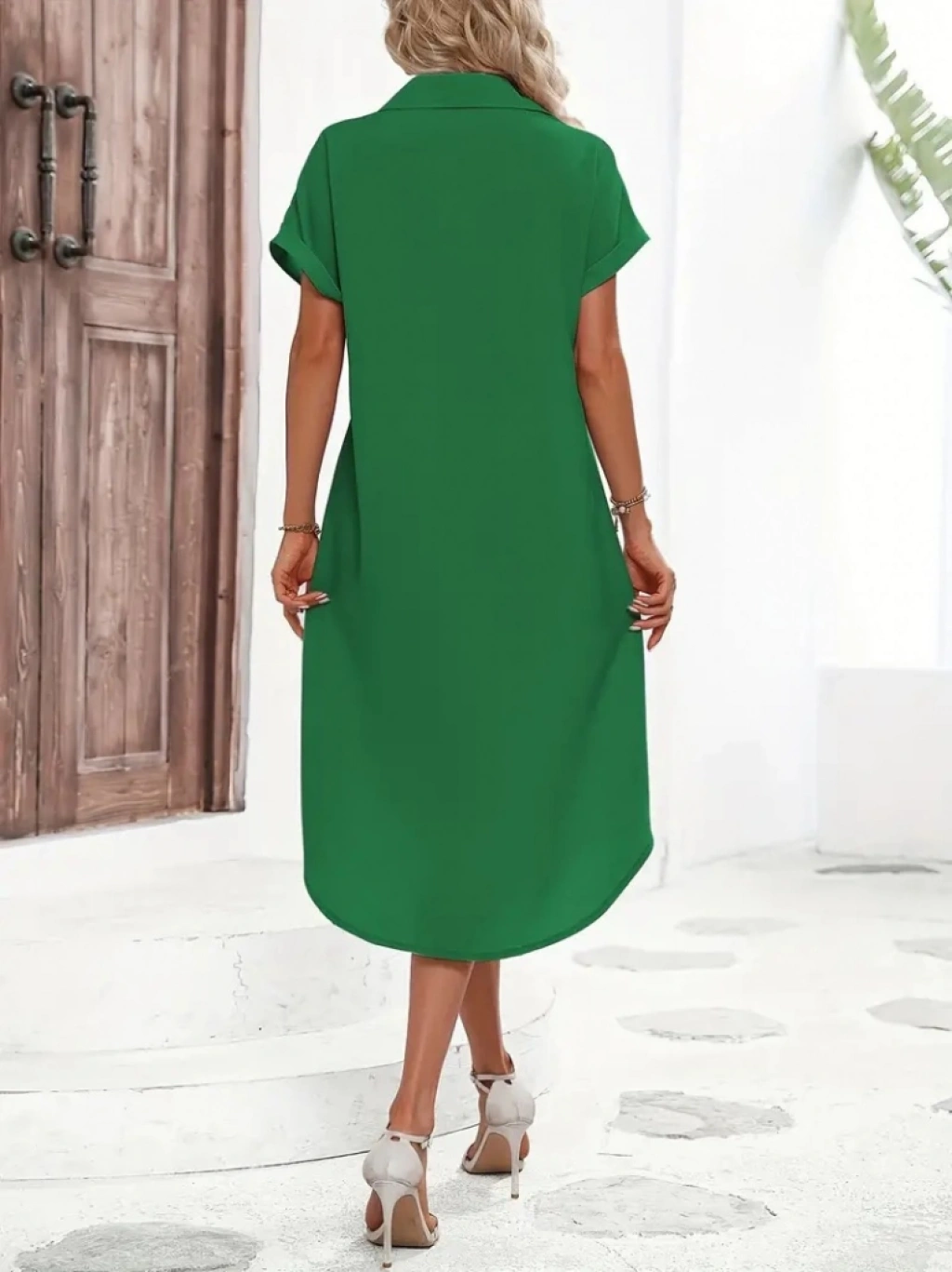 Kadın Kısa Kollu Yakalı Düğme Detay Midi Dokuma Elbise