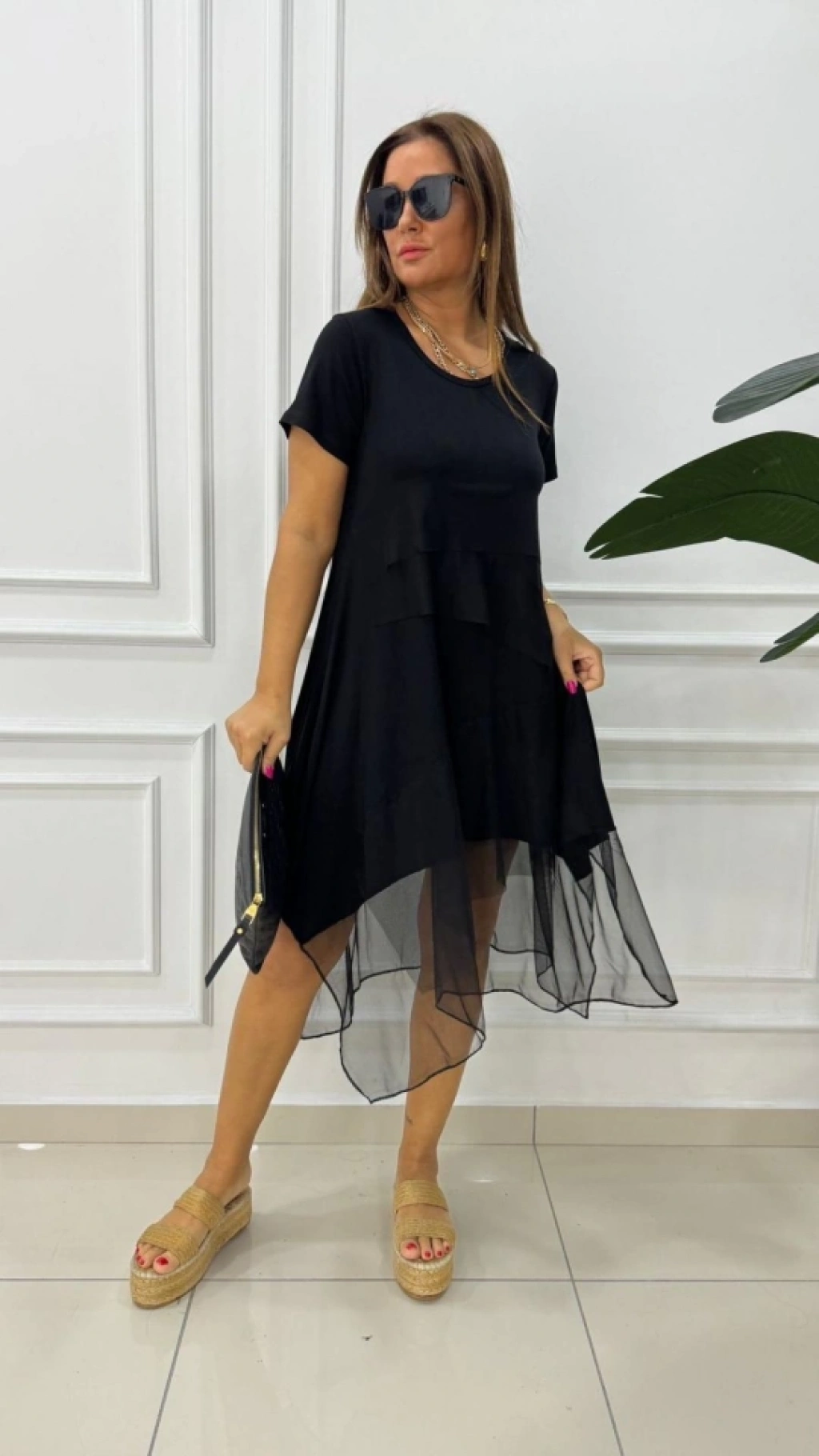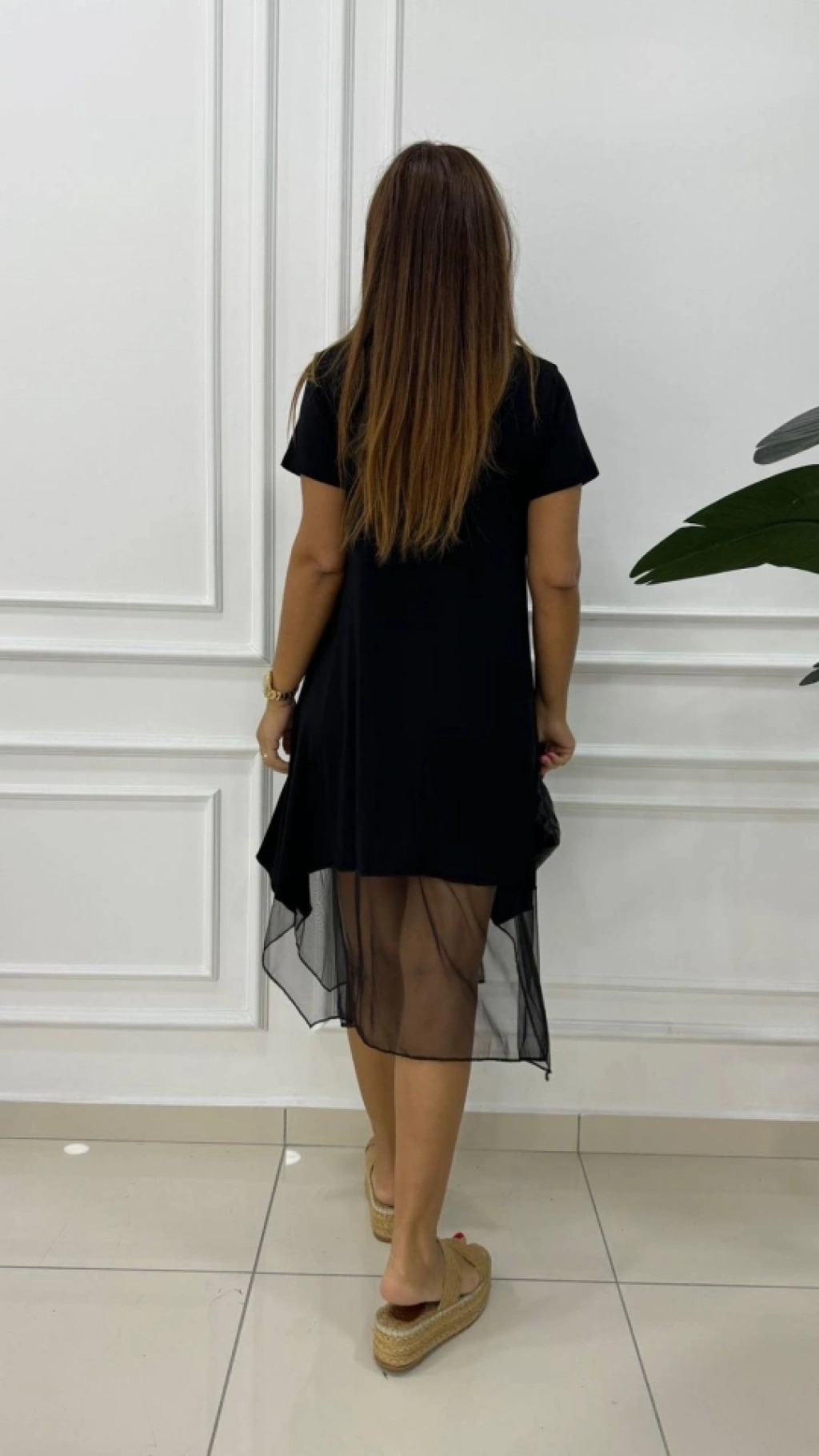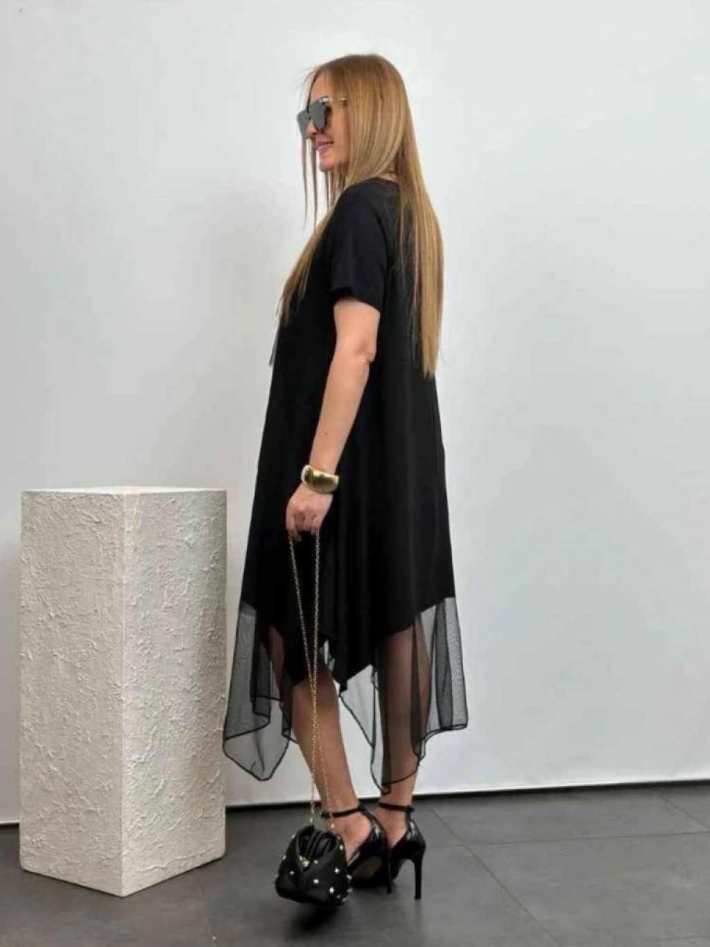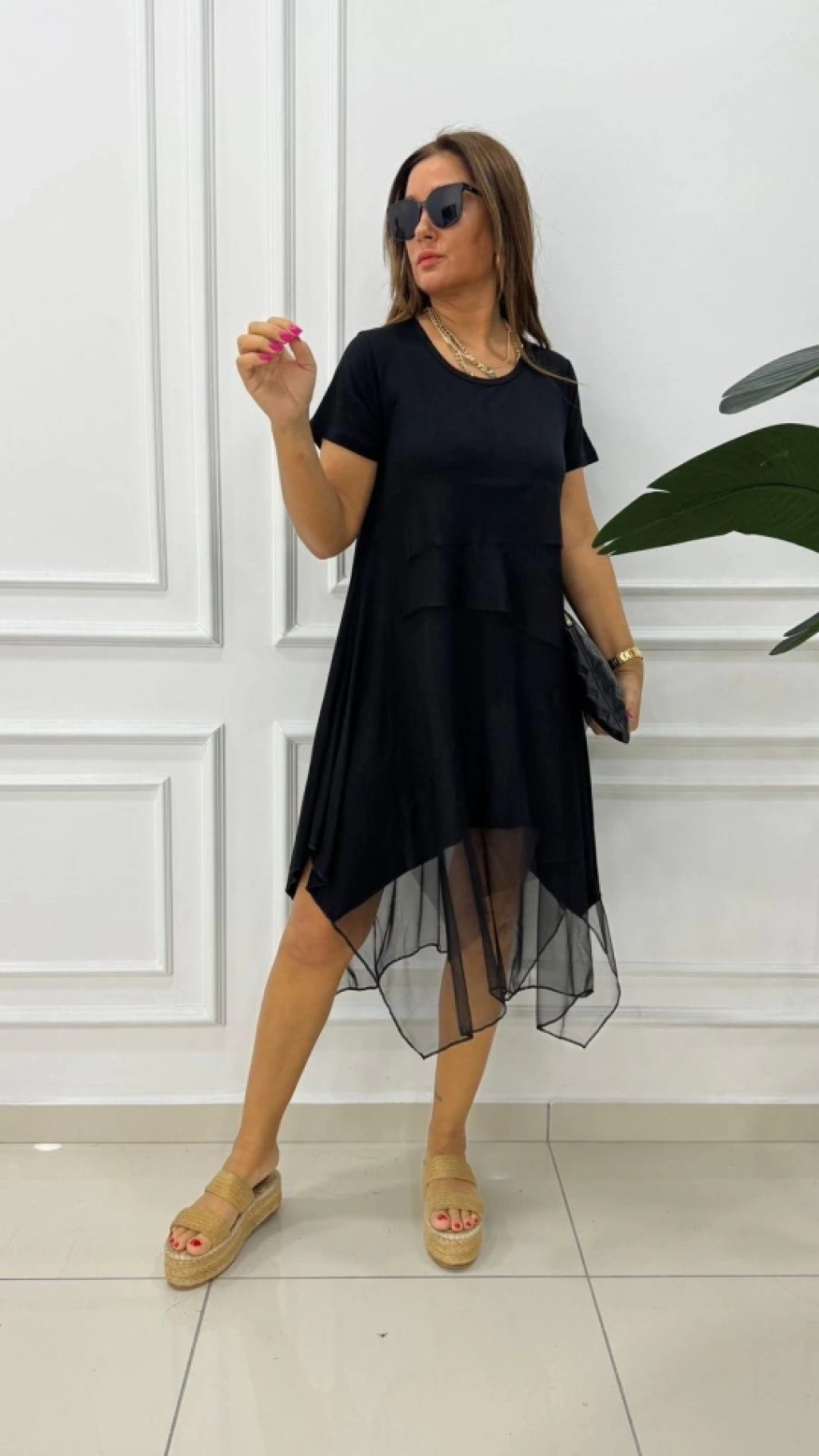 Kadın Kısa Kollu Yuvarlak Tüllü Asimetrik Detaylı Viskon Elbise