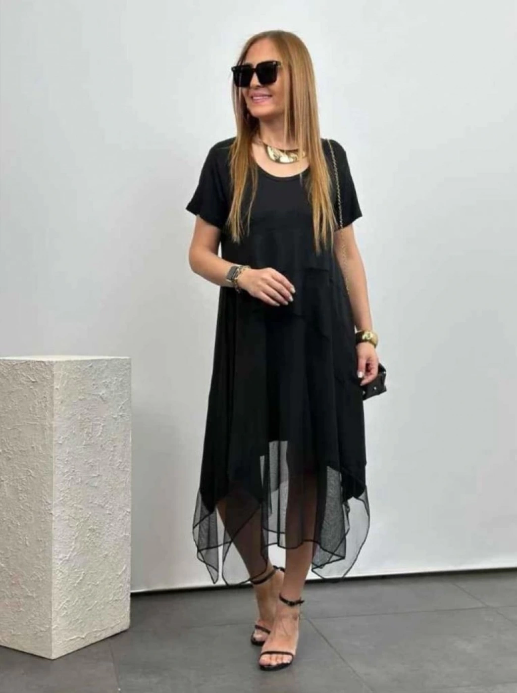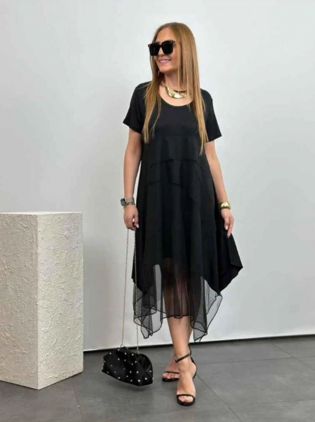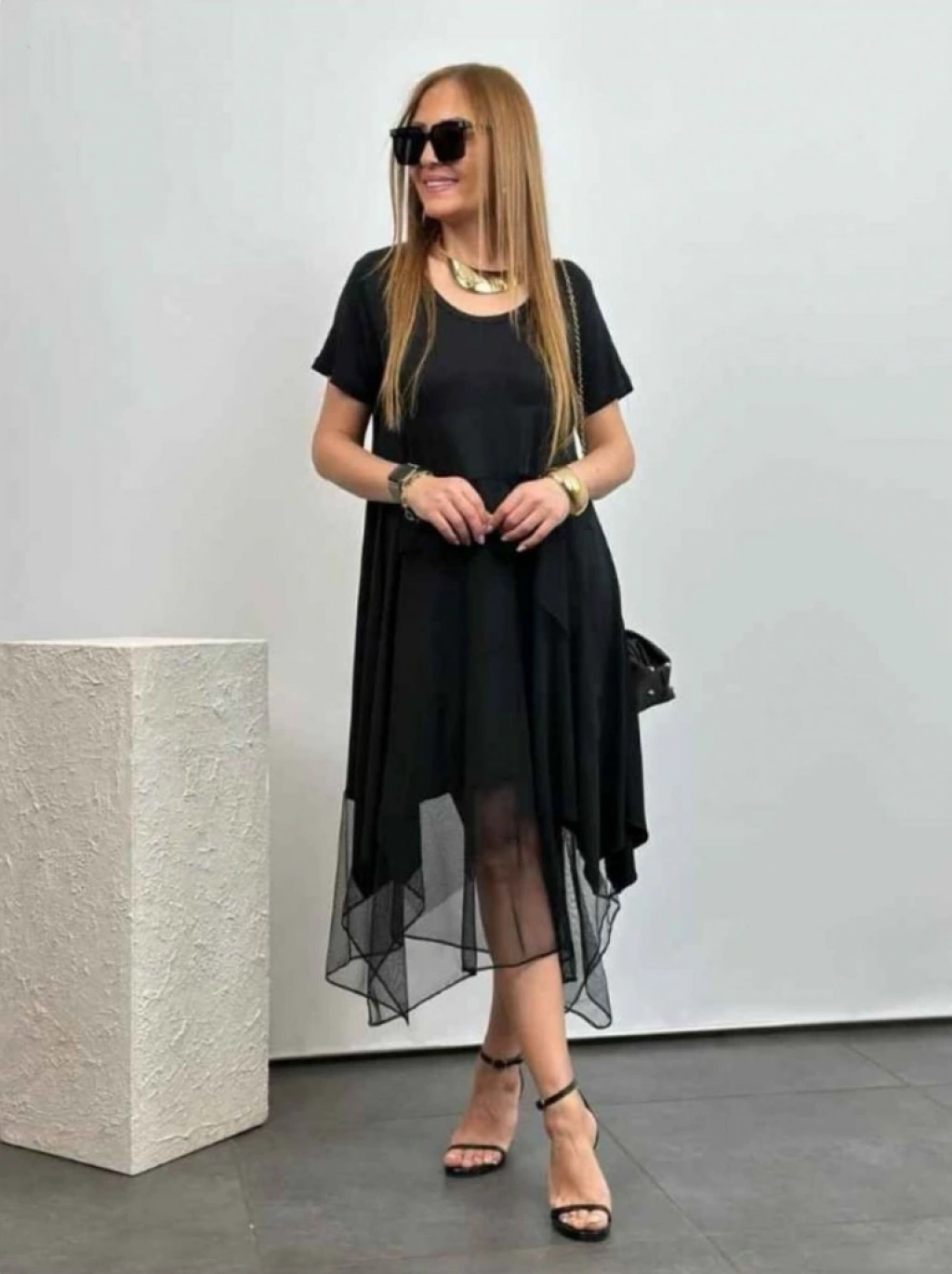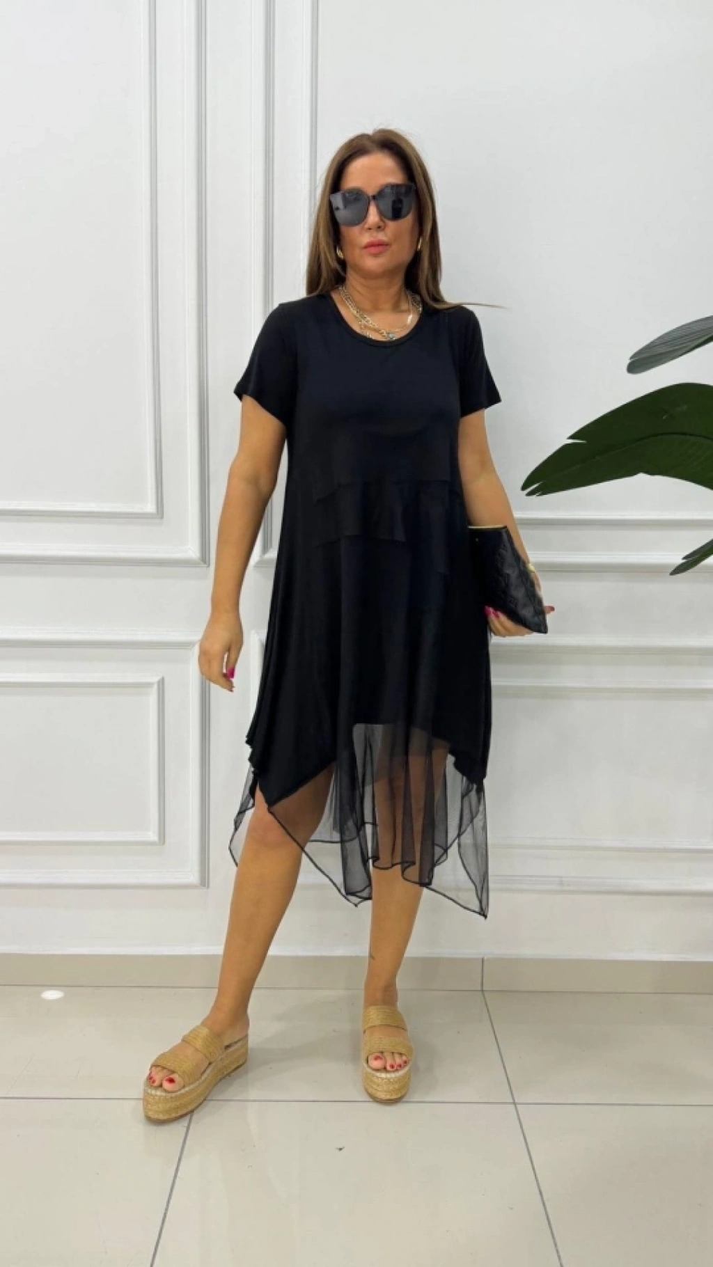 Kadın Kısa Kollu Yuvarlak Tüllü Asimetrik Detaylı Viskon Elbise