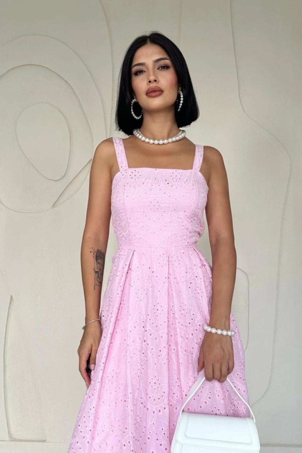 Pembe Askılı Aparatlı Brode Elbise