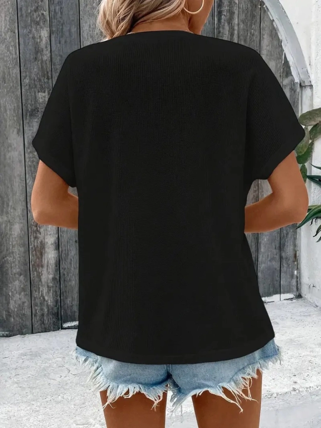 Kadın Kısa Kollu Yakası Açık önden Düğmeli Waffle Bluz