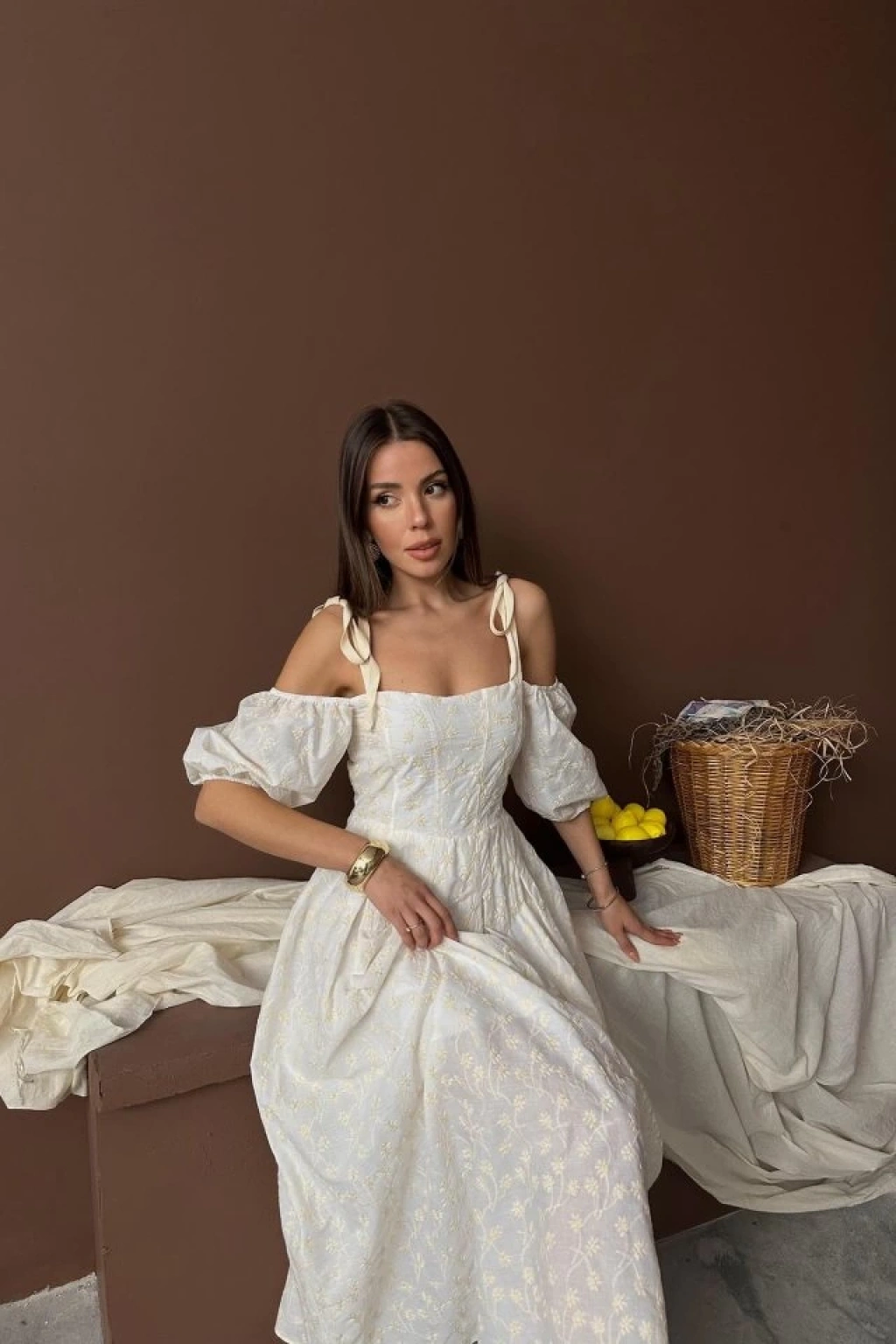 Bej Omuzu Bağcıklı Balon Kollu Brode Elbise
