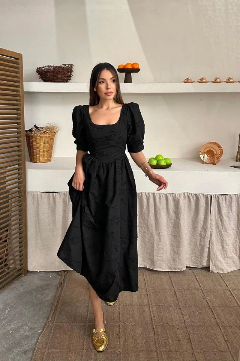 Siyah Balon Kollu Brode Elbise