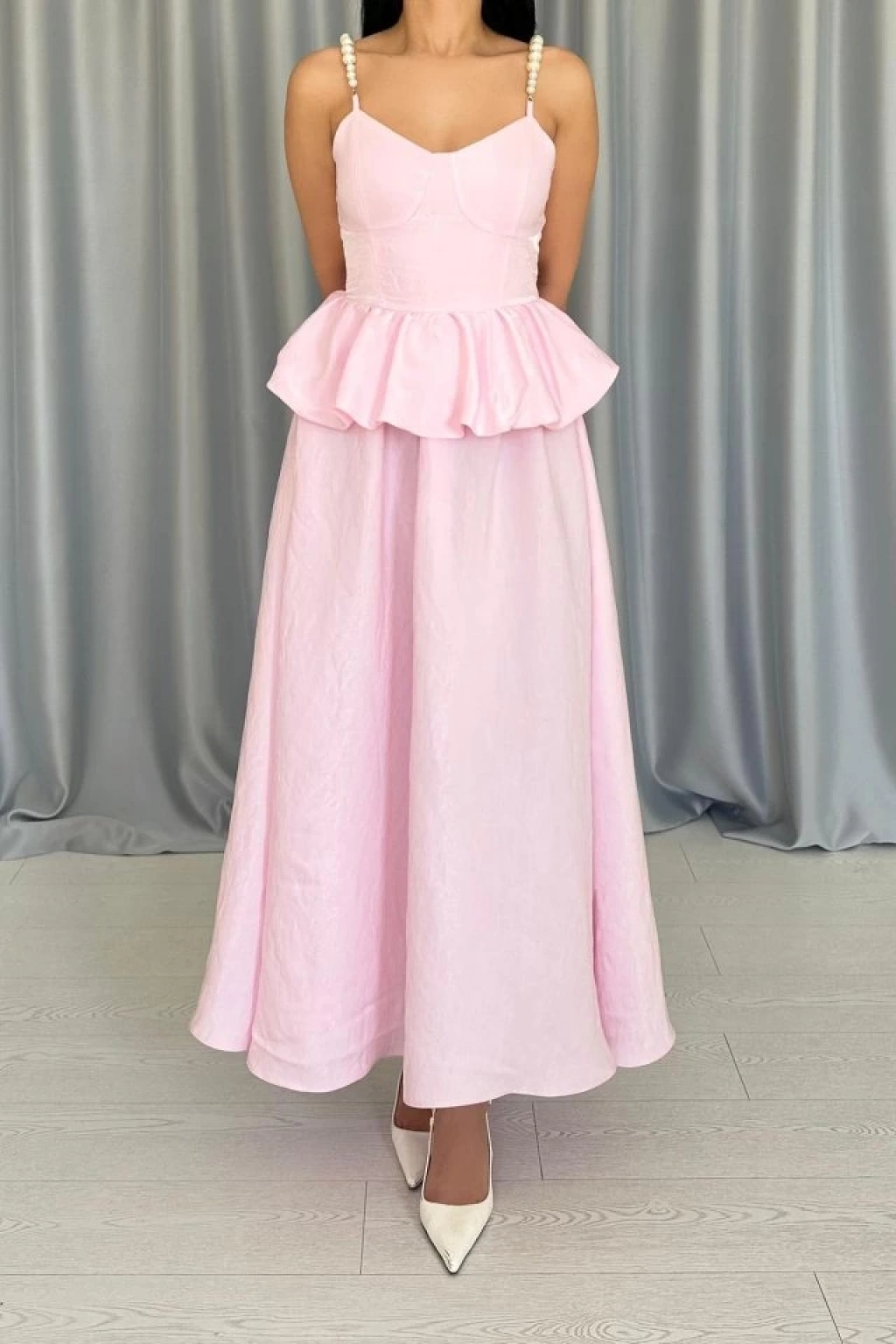 Pembe Beli Büzgülü İnci Askılı Uzun Elbise