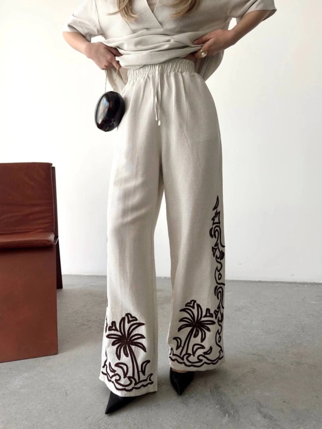 Keten Kısa Kolu V Yaka Bluz Pantolon Ikili Takım- Beyaz