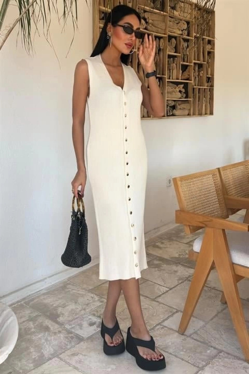Önü Düğmeli Fitilli Kolsuz Elbise 2832