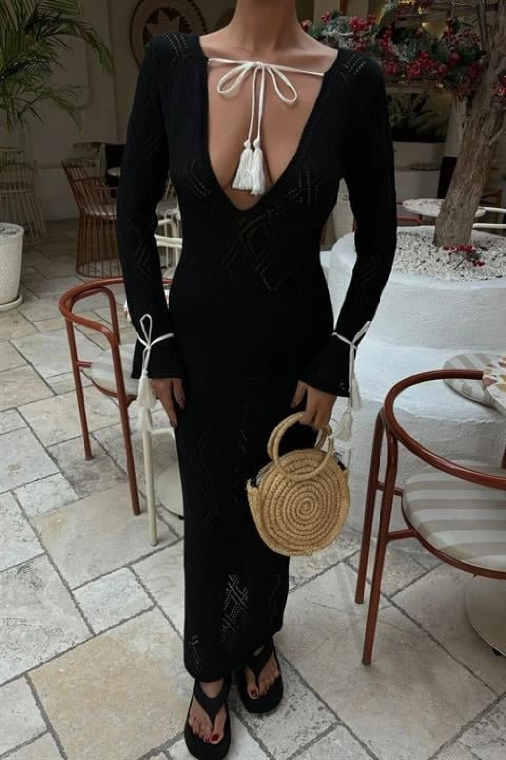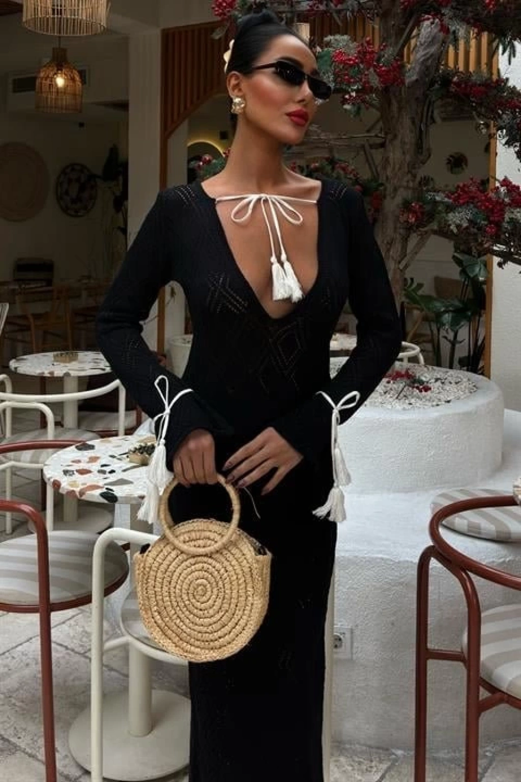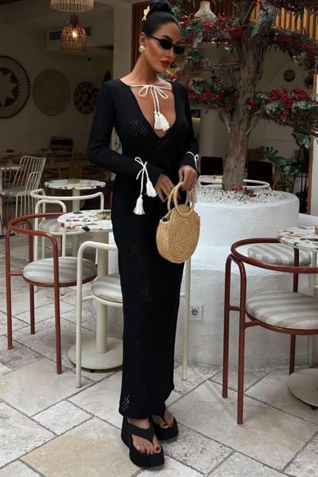 Püskül Bağcık Detaylı V Yaka Ajurlu Elbise 2850