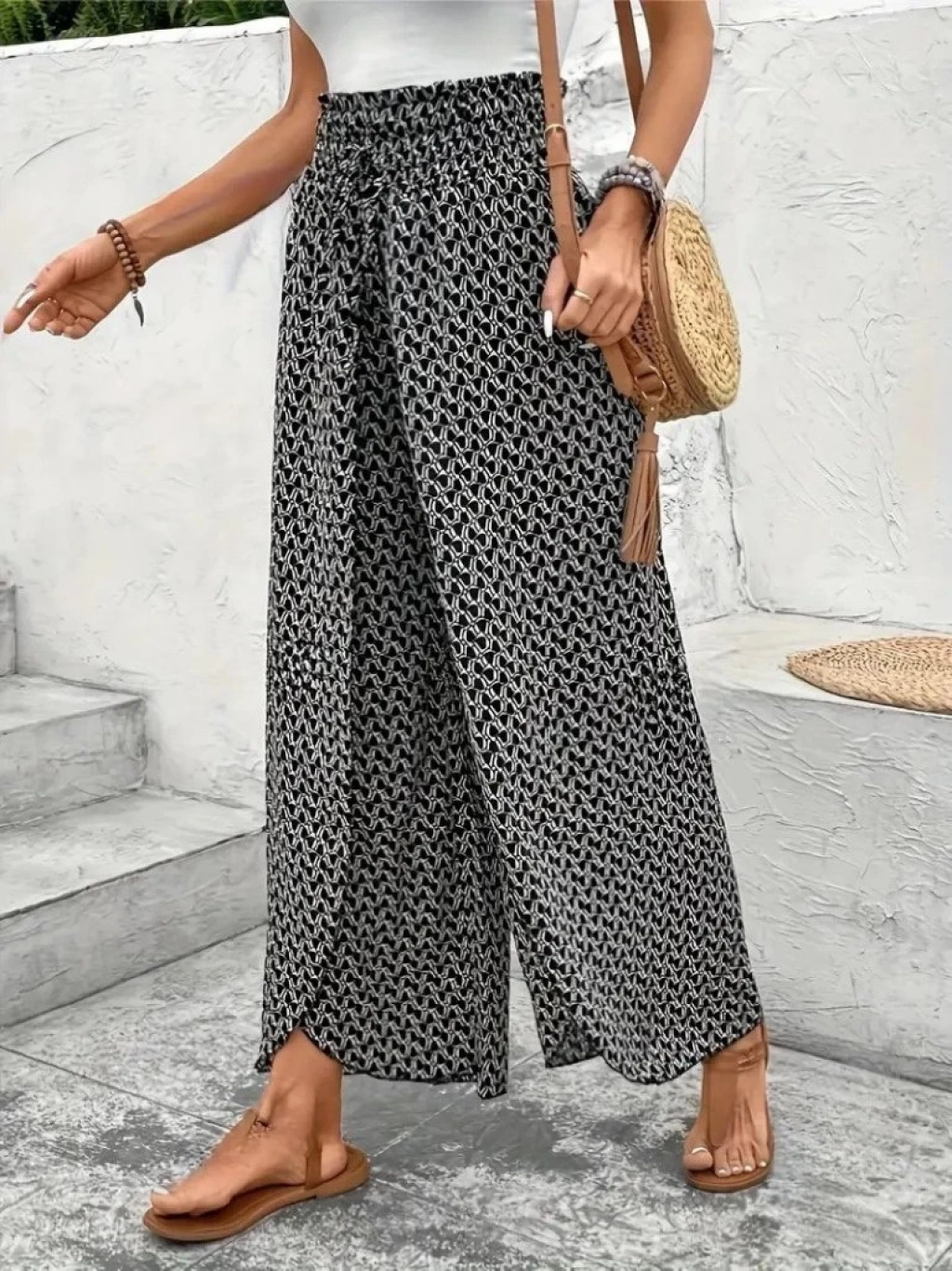 Kadın Yüksek Bel Lastikli önden Iki Parçalı Desenli Bürümcük Pantolon