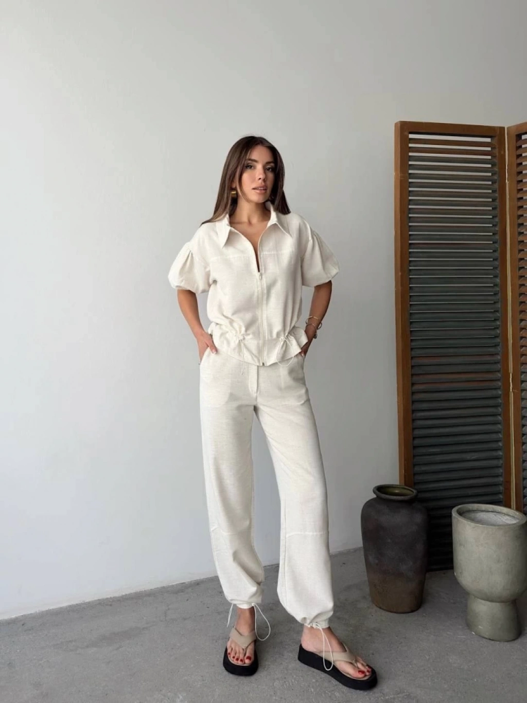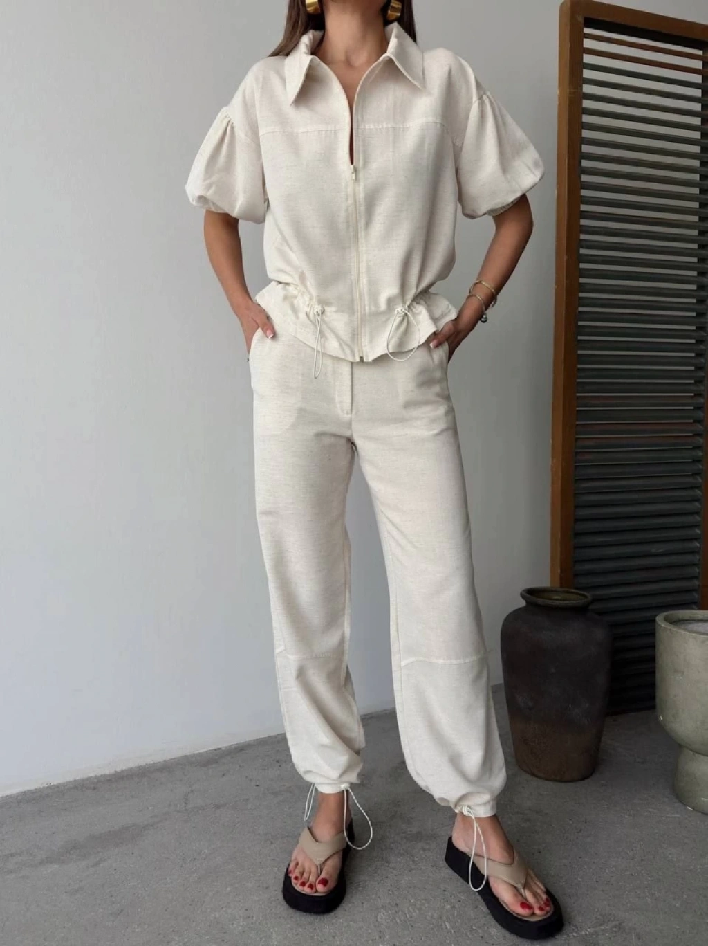 Keten Tam Fermuarlı Kısa Kollu Gömlek Pantolon Ikili Takım - Beyaz
