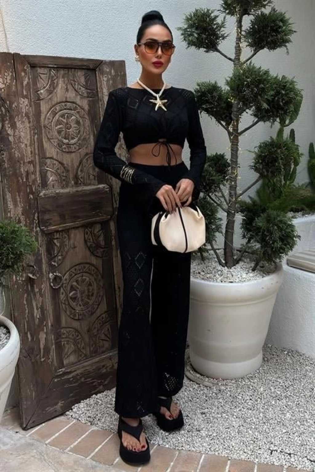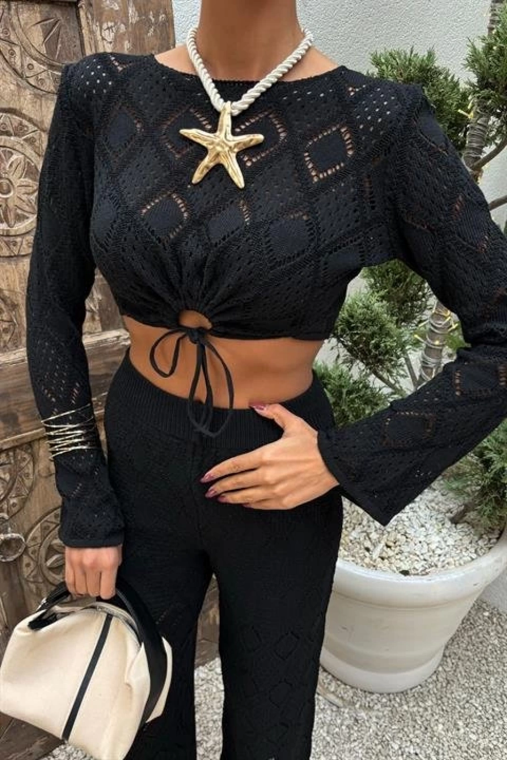 Göğüs Bağcık Detaylı Ajurlu Bluz Pantolon Takım 10098